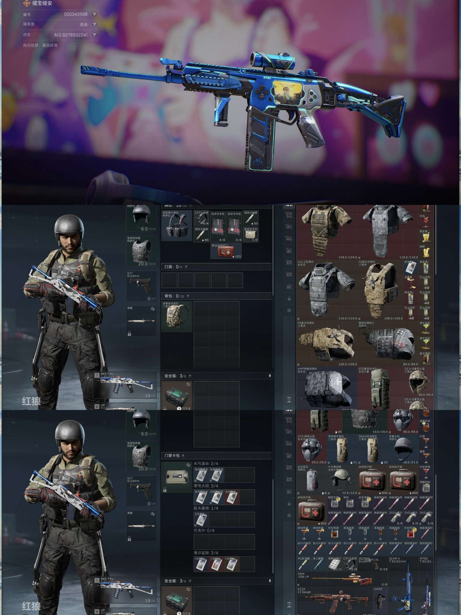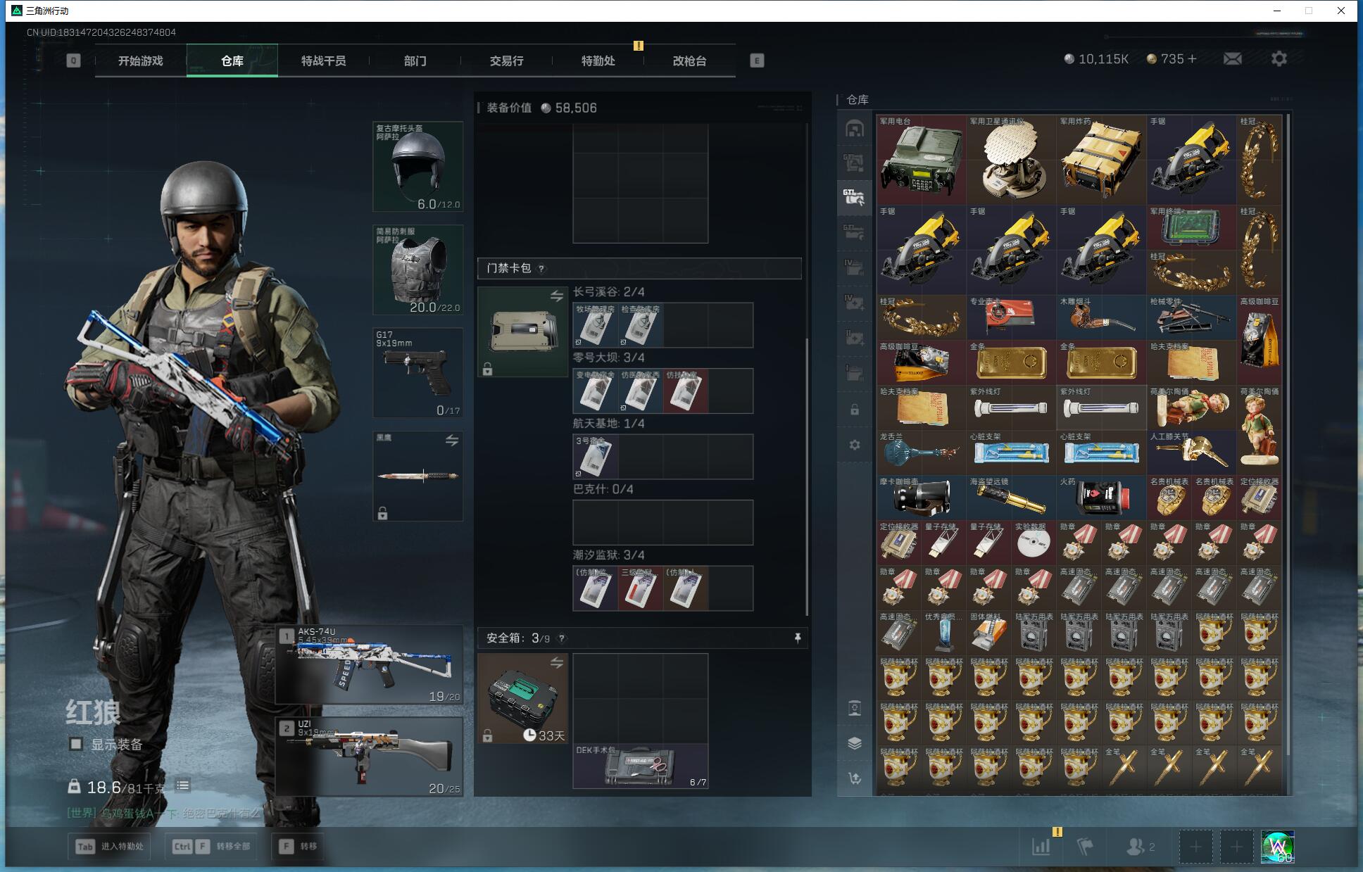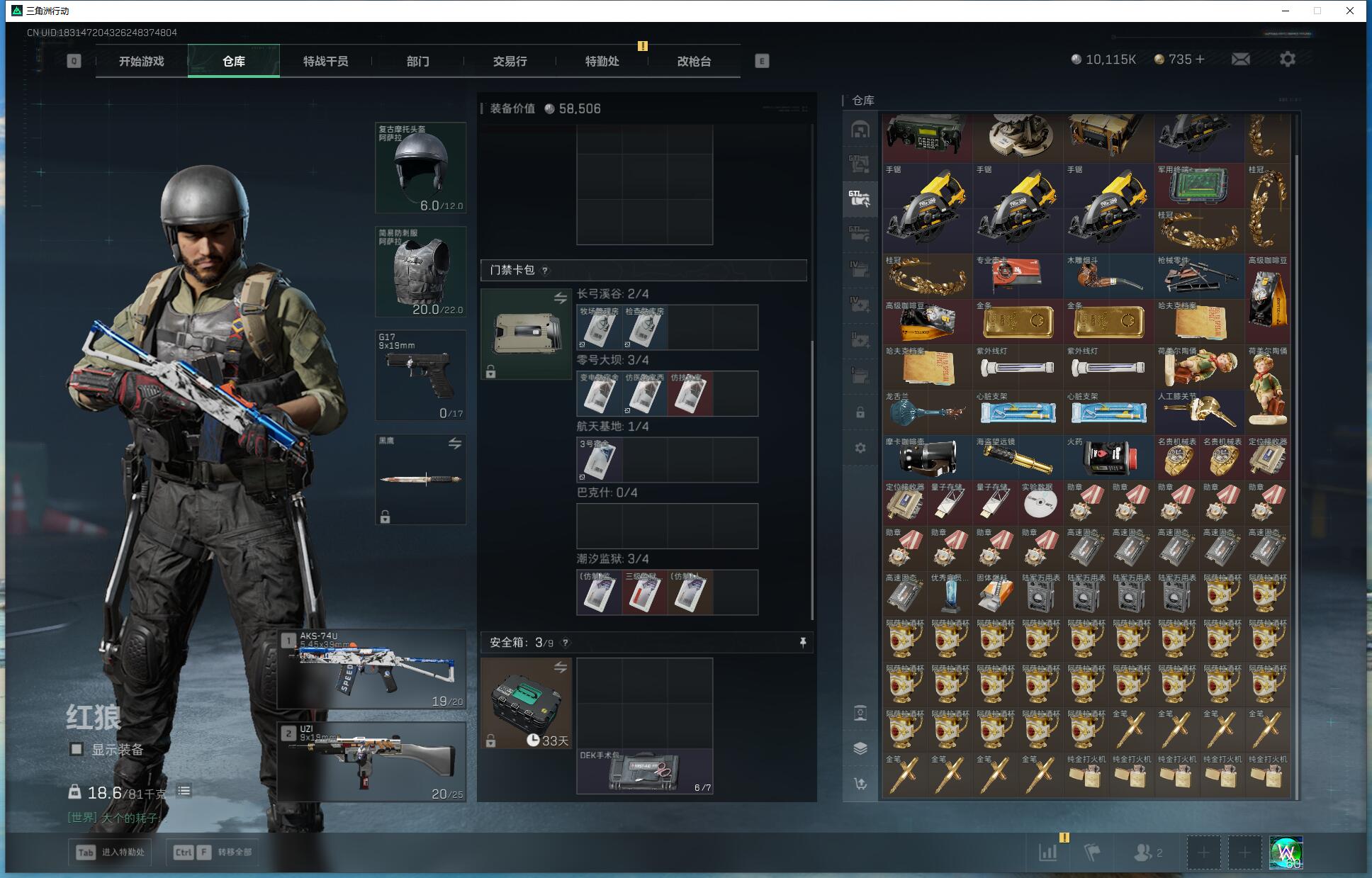 X5390/Q区/可排位/总资产158M/哈夫币1000W/行动等级60/战场等级50/红狼蚀金玫瑰