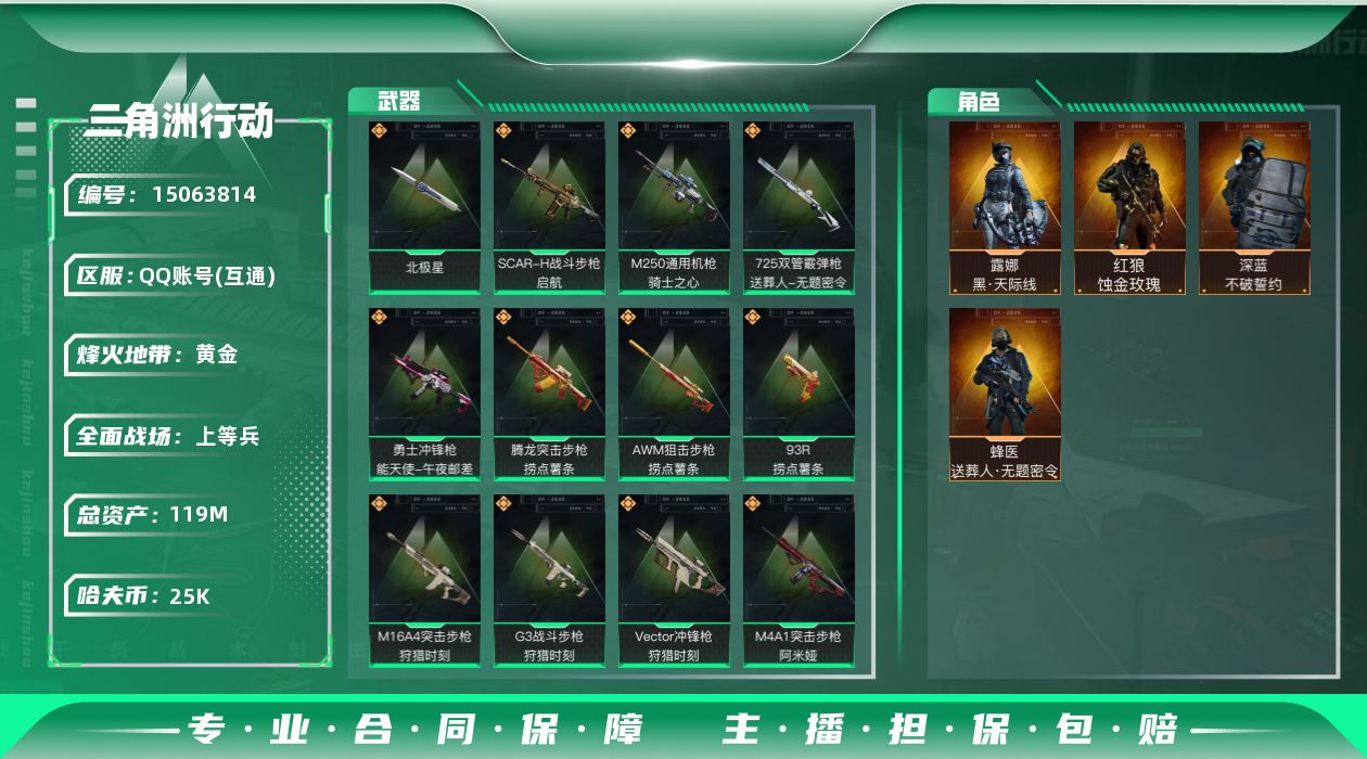 总资产(M):119M/哈夫币(K):25K/哈夫币(K):25K/全面战场等级:29_段位:上等兵