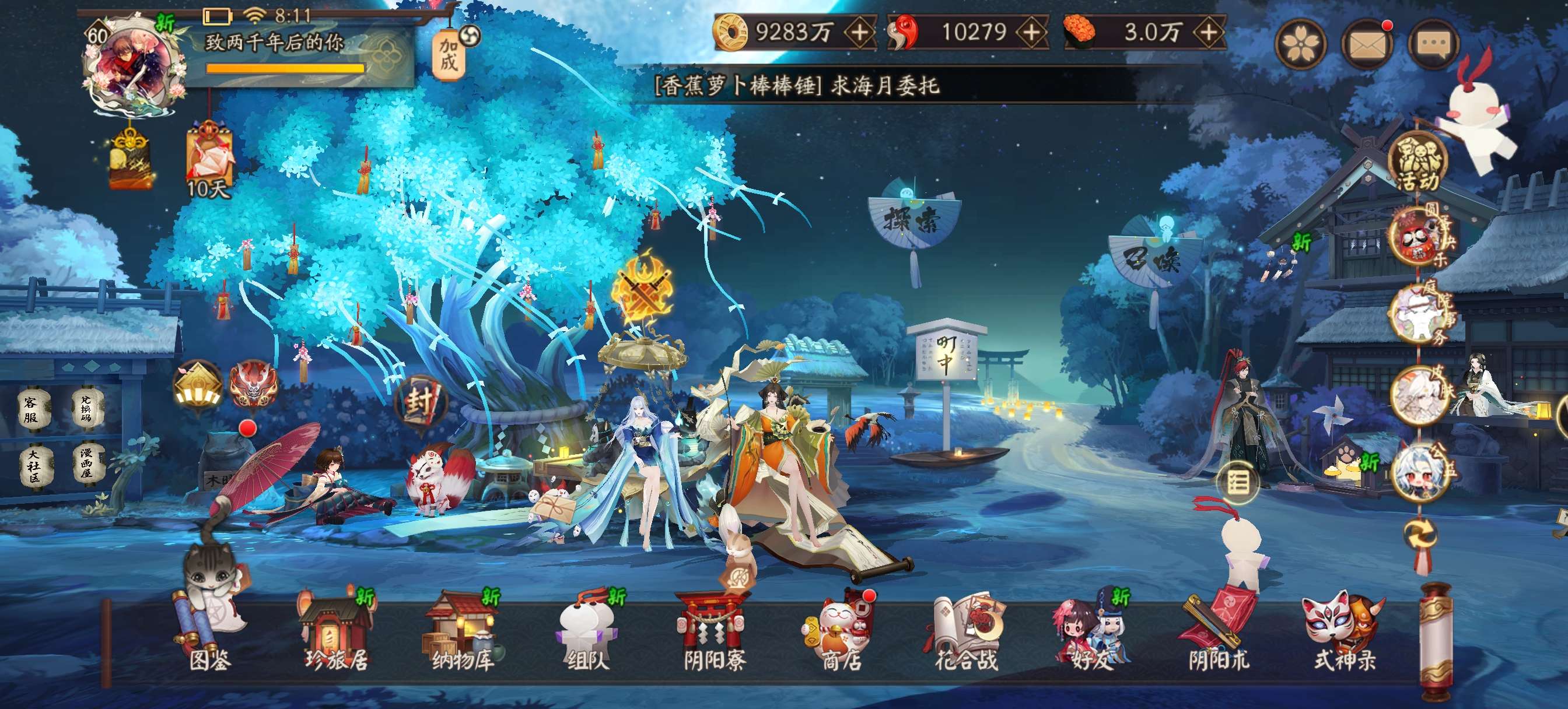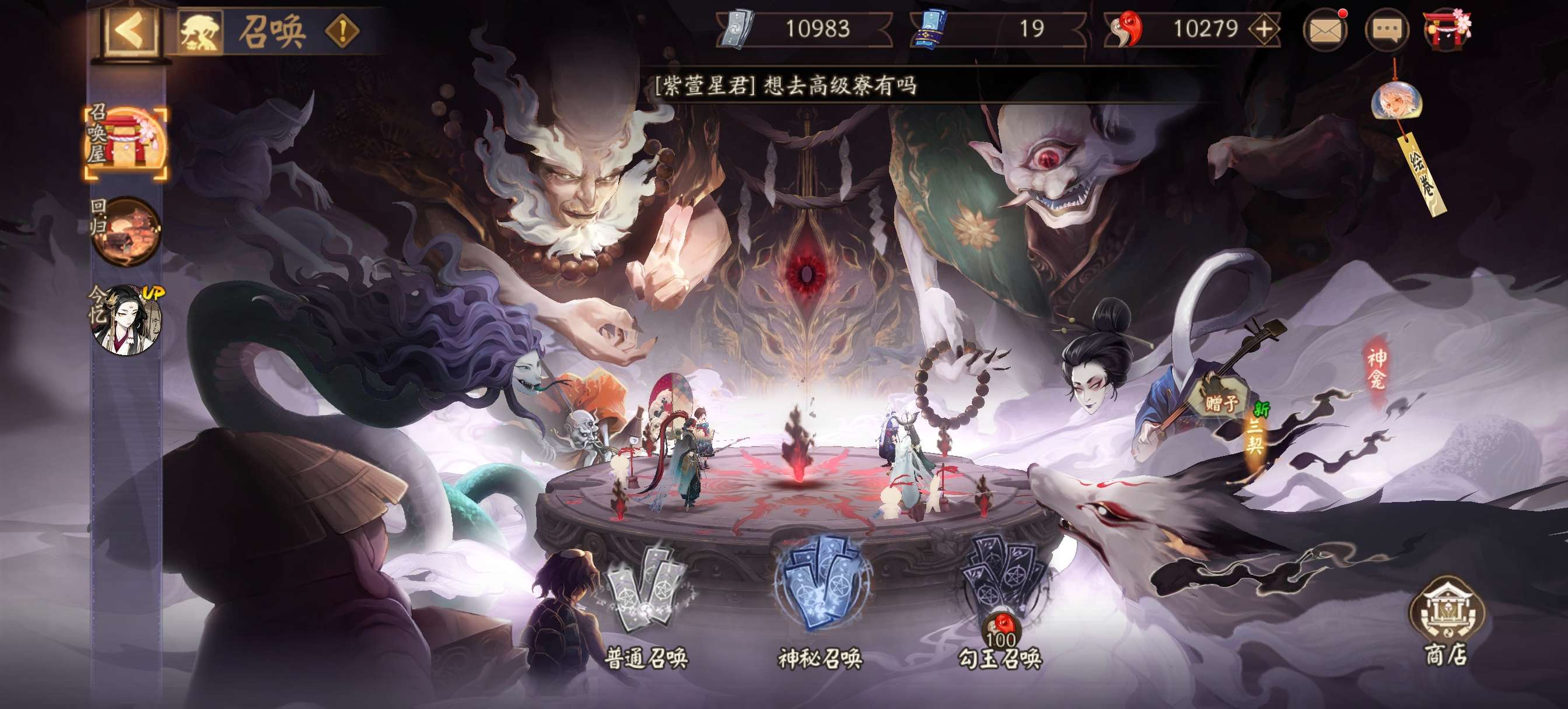 1万勾19抽,斗技多套阵容挂机名仕,一速159,有回归福利,鬼吞花烬天玉藻前缘结神茶几等多典藏皮