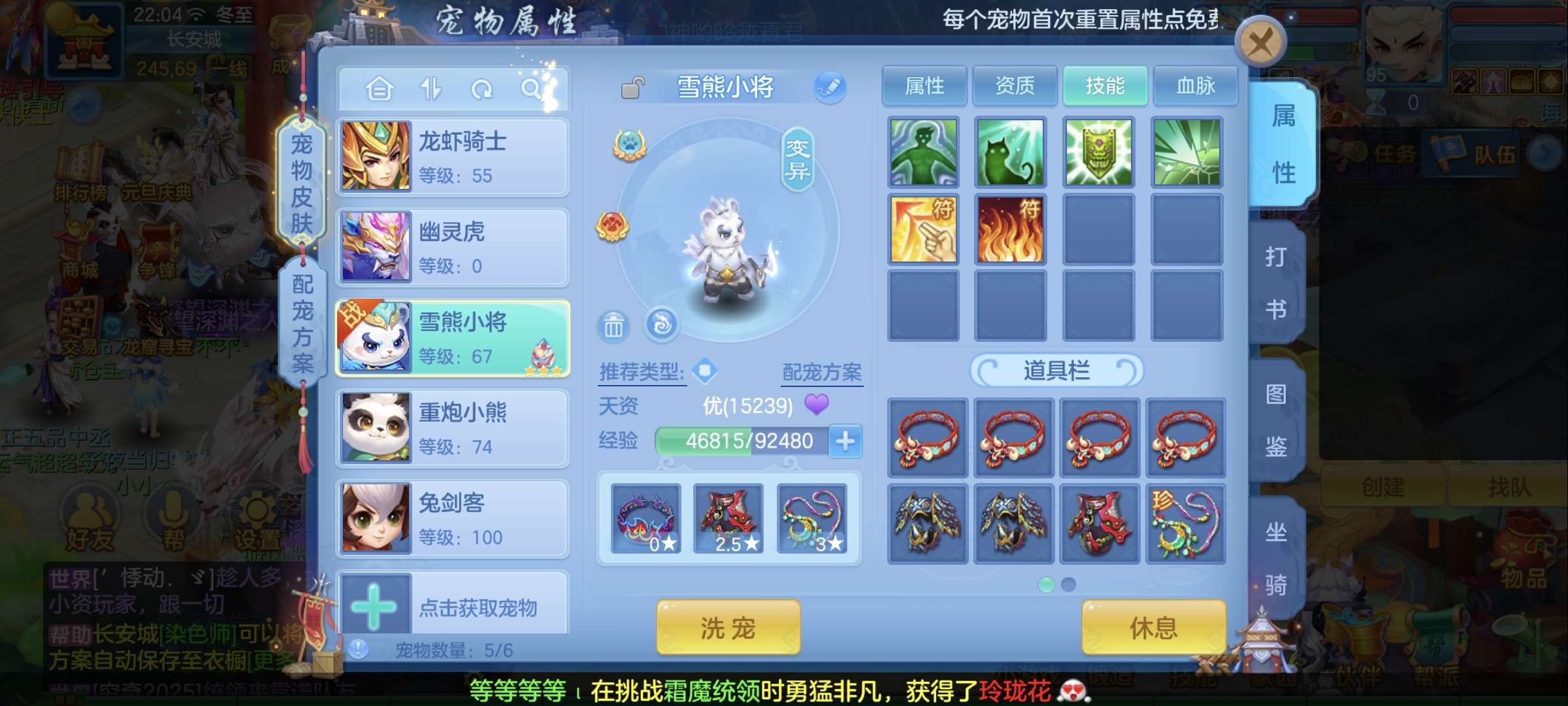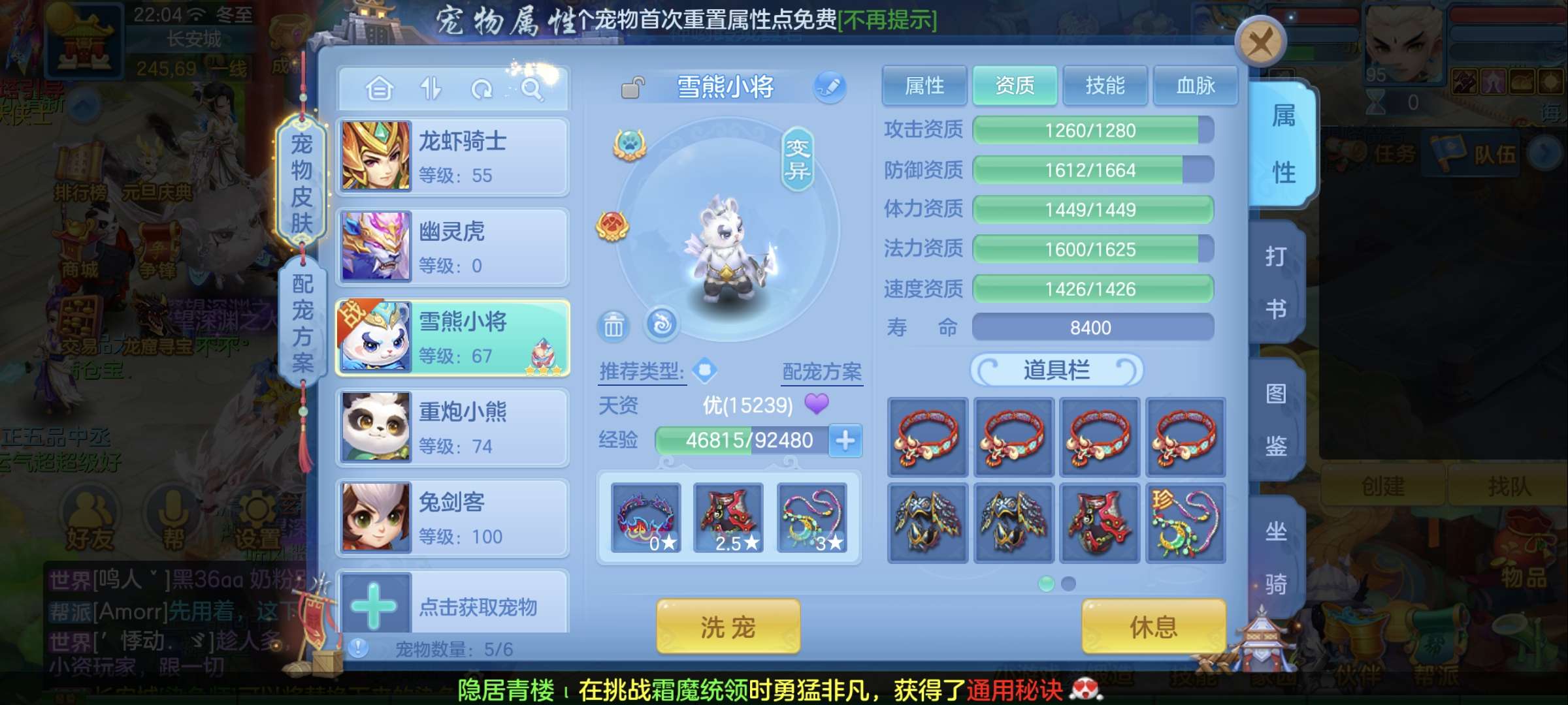 7亿铜币,900w银子,12000还童丹,3500宠物积分,天赋小熊,满级坐骑,5技能高必兔,2头像