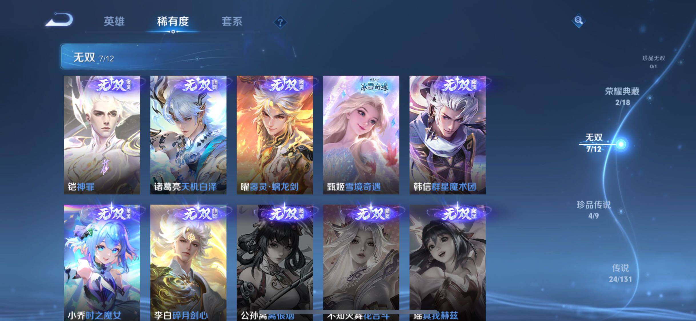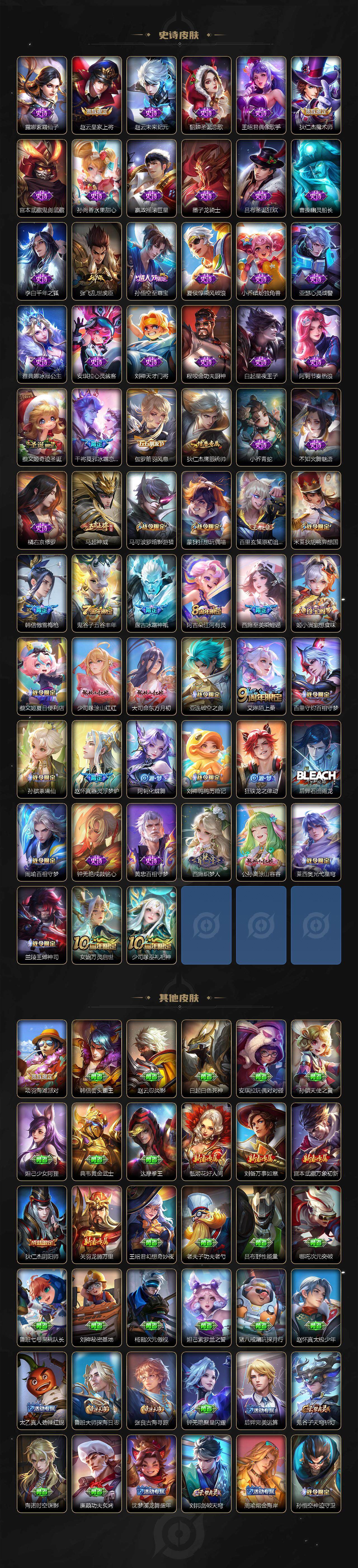 【无双皮肤】:李白碎月剑心,小乔时之魔女,韩信群星魔术团,甄姬雪境奇遇,曜器灵螭龙剑,诸葛亮天机白泽,铠神罪