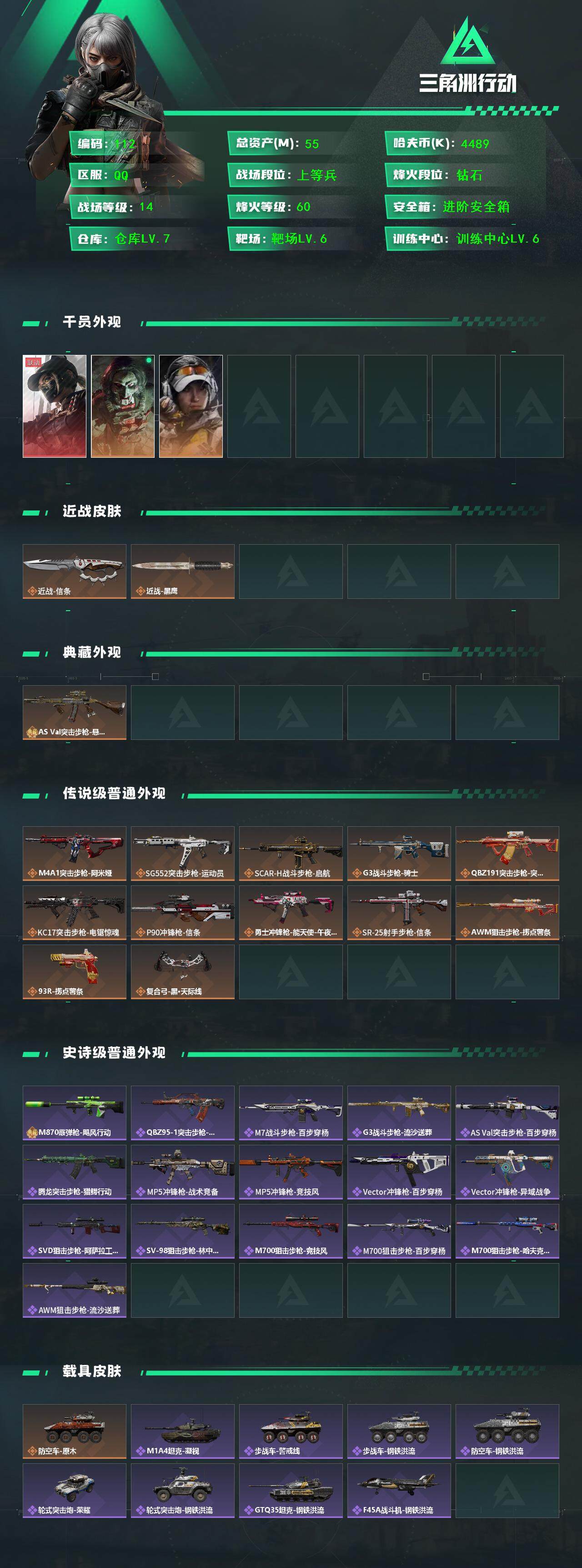55m总资产-4489k哈伏币-60烽火等级-钻石-14战场等级-上等兵 ME