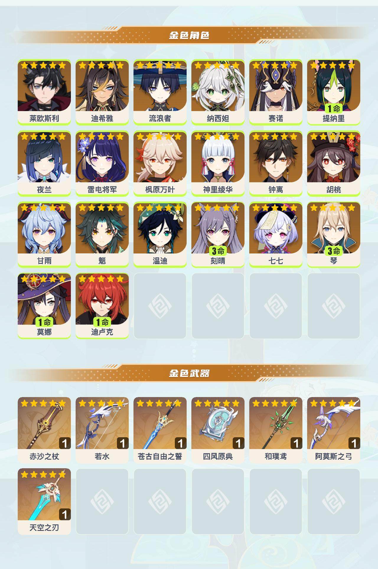 0命莱欧斯利,0命迪希雅,0命流浪者,0命纳西妲,0命赛诺,1命提纳里,0命夜兰,0命雷电将军,0命枫原万叶,0命神里绫华,0命钟离,0命胡桃,0命甘雨,0命魈,0命温迪,3命刻晴,0命七七,3命琴,1命莫娜,1命迪卢克,精1赤沙之杖,精1若水,精1苍古自由之誓,精1四风原典,精1和璞鸢,精1阿莫斯之弓,精1天空之刃