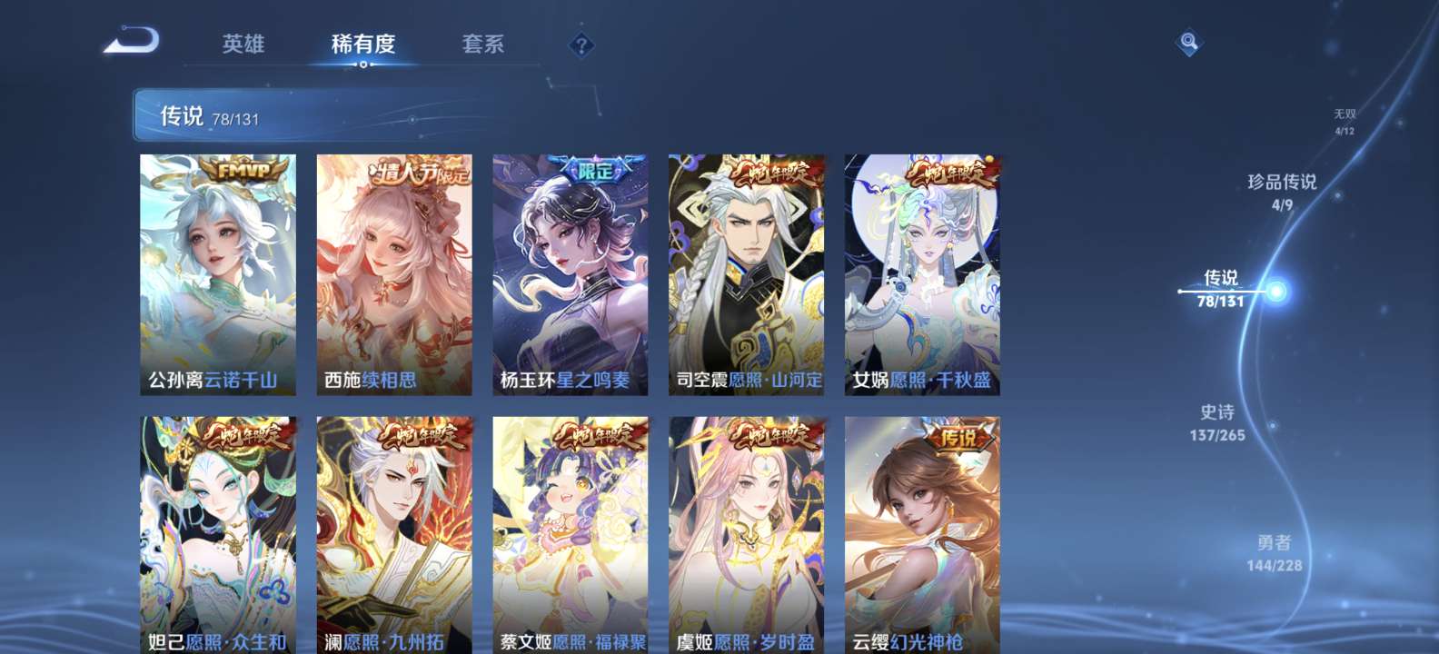 皮肤444 英雄127 荣耀王者 荣耀典藏5 无双皮肤4 珍品传说4 传说78 其他皮肤146-非常好值得购买上班没时间了