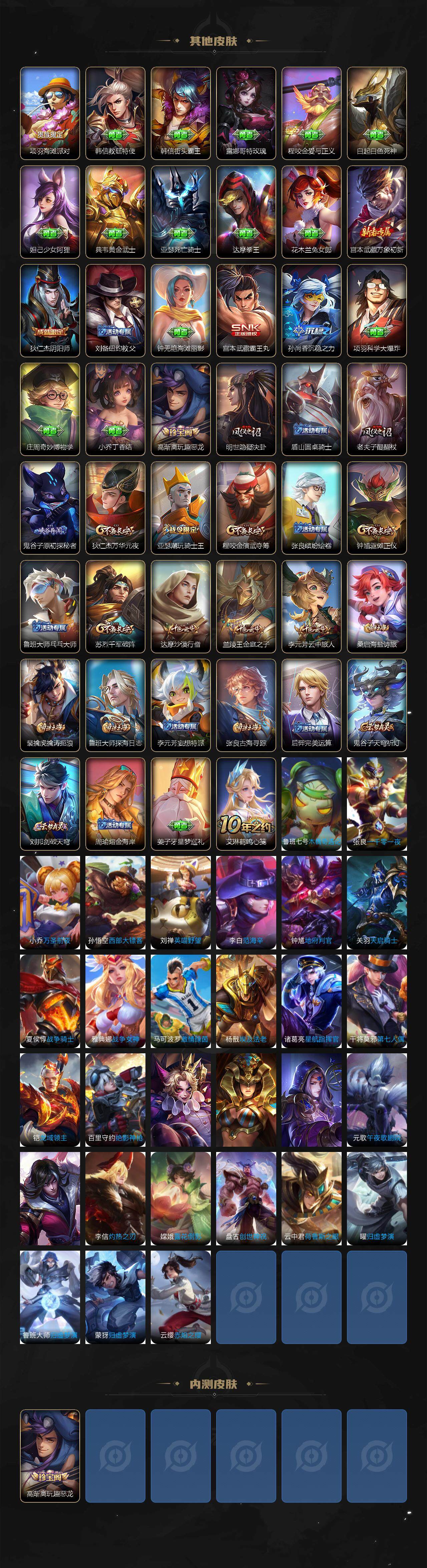 【限定皮肤】:狄仁杰阴阳师,赵云皇家上将,庄周高山流水,高渐离玩趣恶龙,元歌云间偶戏,元歌无心,狄仁杰魔术师,狄仁杰万华元夜,达摩沙漠行僧,项羽海滩派对,老夫子醍醐杖,程咬金演武夺筹,韩信逐梦之影,兰陵王金庭之子,亚瑟潮玩骑士王,李元芳云中旅人,钟馗驱傩正仪,鬼谷子原初探秘