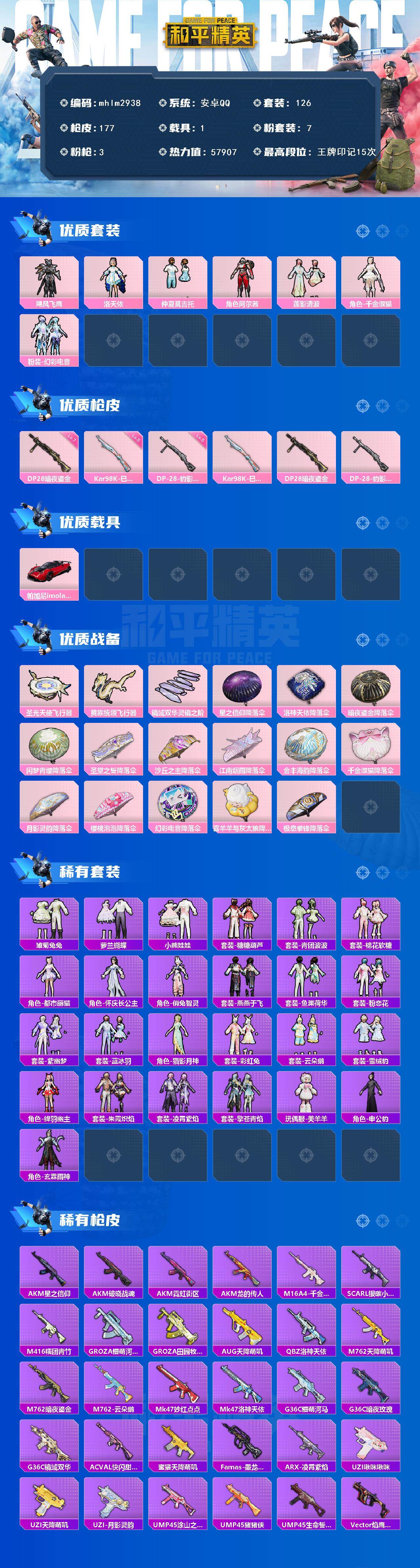 【mhlm2938】安卓 手Q-7粉装-3特效枪-1载具-4粉色飞行器-57907热力值-15王牌印记-126套装-177枪皮
