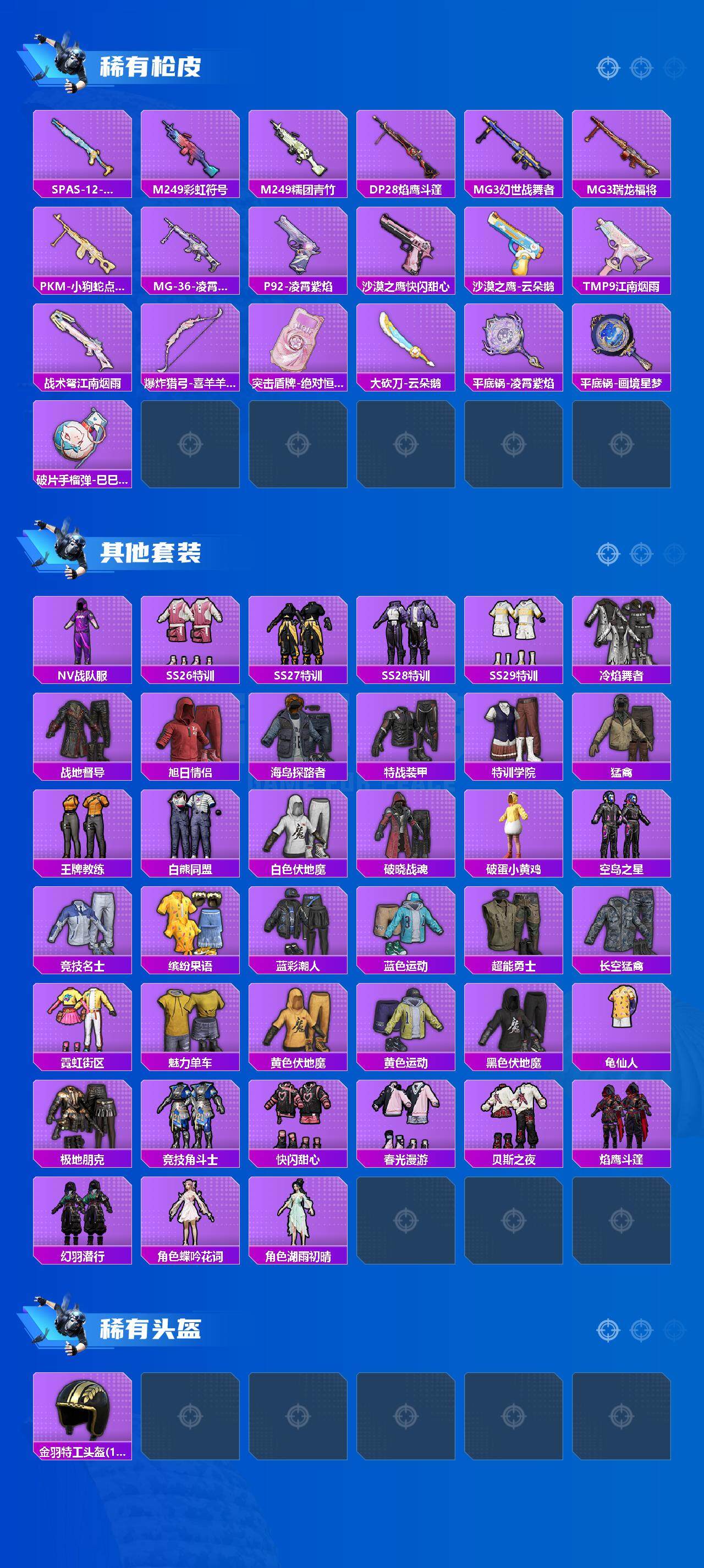 【粉色枪皮等级】:AKM-绿萝繁花(五级),M416-电玩时刻(五级),Kar98K-巳巳如意(五级),DP-28-豹影疾电(五级),PKM-江南烟雨(七级)