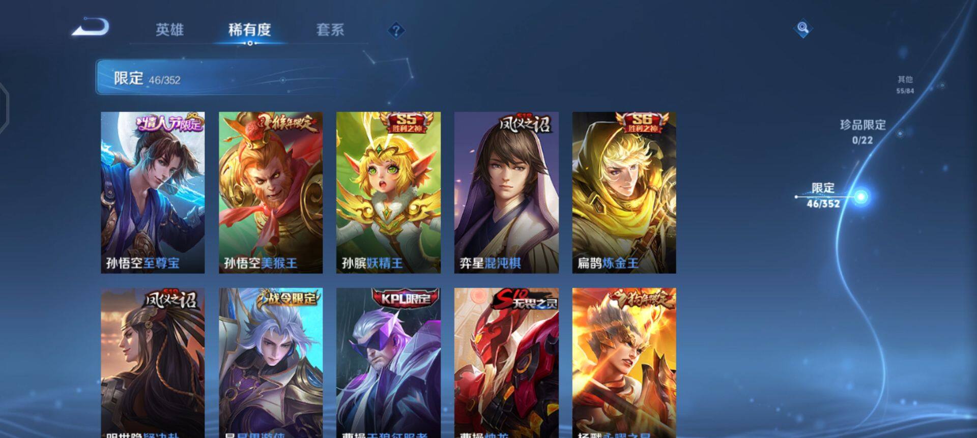 【传说皮肤】:虞姬启明星使,梦奇胖达荣荣,后羿黄金射手座,杨戬永曜之星,貂蝉仲夏夜之梦,孙尚香末日机甲,宫本武藏地狱之眼,孙悟空地狱火,狄仁杰超时空战士