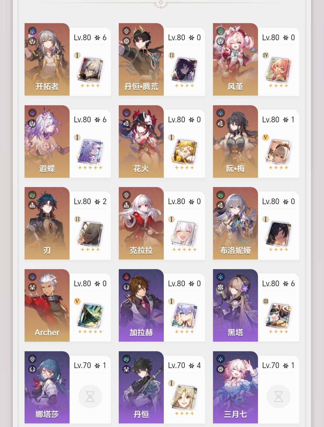 满命遐蝶6+1带风堇、花火,号上还有30多抽,卡池大保底已垫45,新版本活动剧情没过,还能打不少星琼