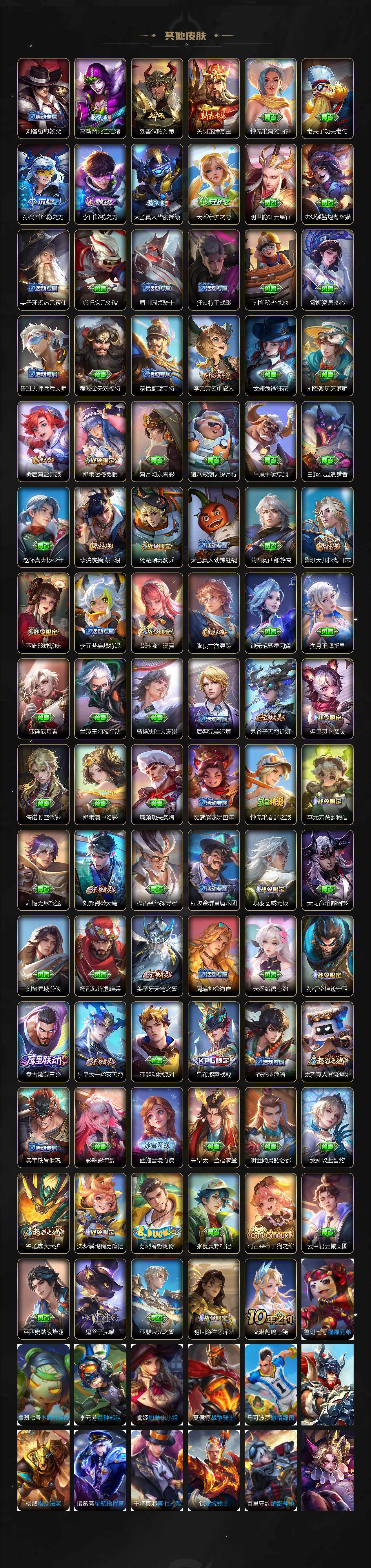 【传说皮肤】:桑启鸣野蒿,李信山海炽霜斩,马超无双飞将,刘备时之恋人,干将莫邪久胜战神,达摩黄金狮子座,宫本武藏地狱之眼,狄仁杰超时空战士