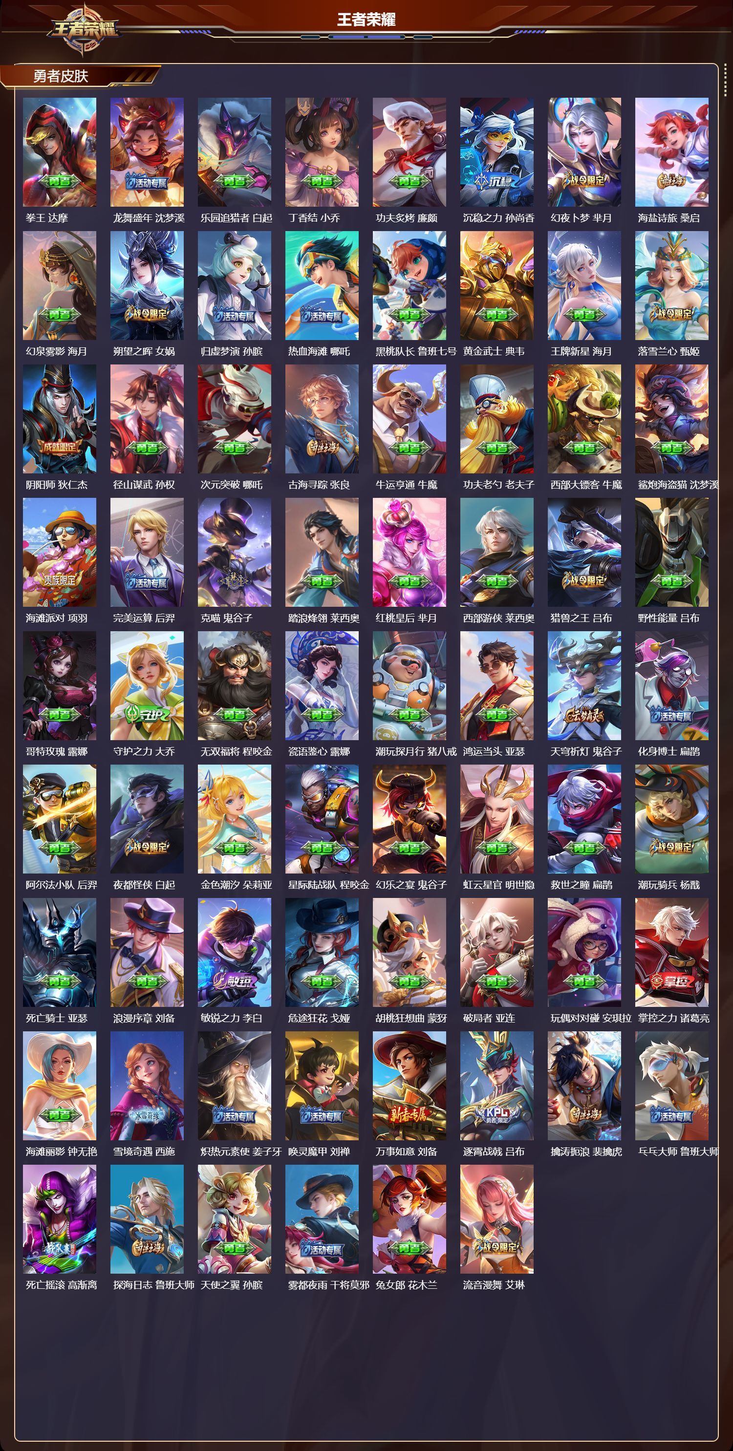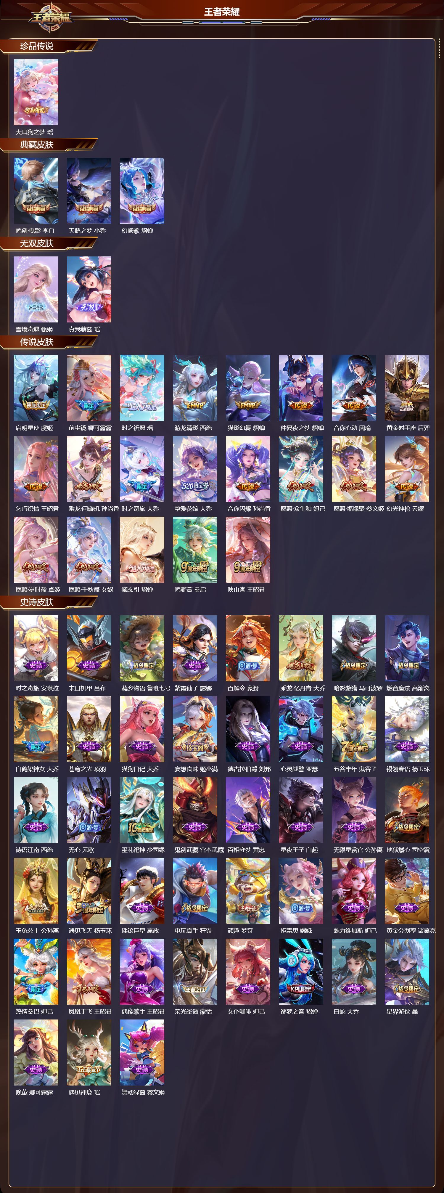 安卓QQ/至圣王者/340皮肤/127英雄/3典藏/0珍品无双/2无双/1珍品传说/21传说/106