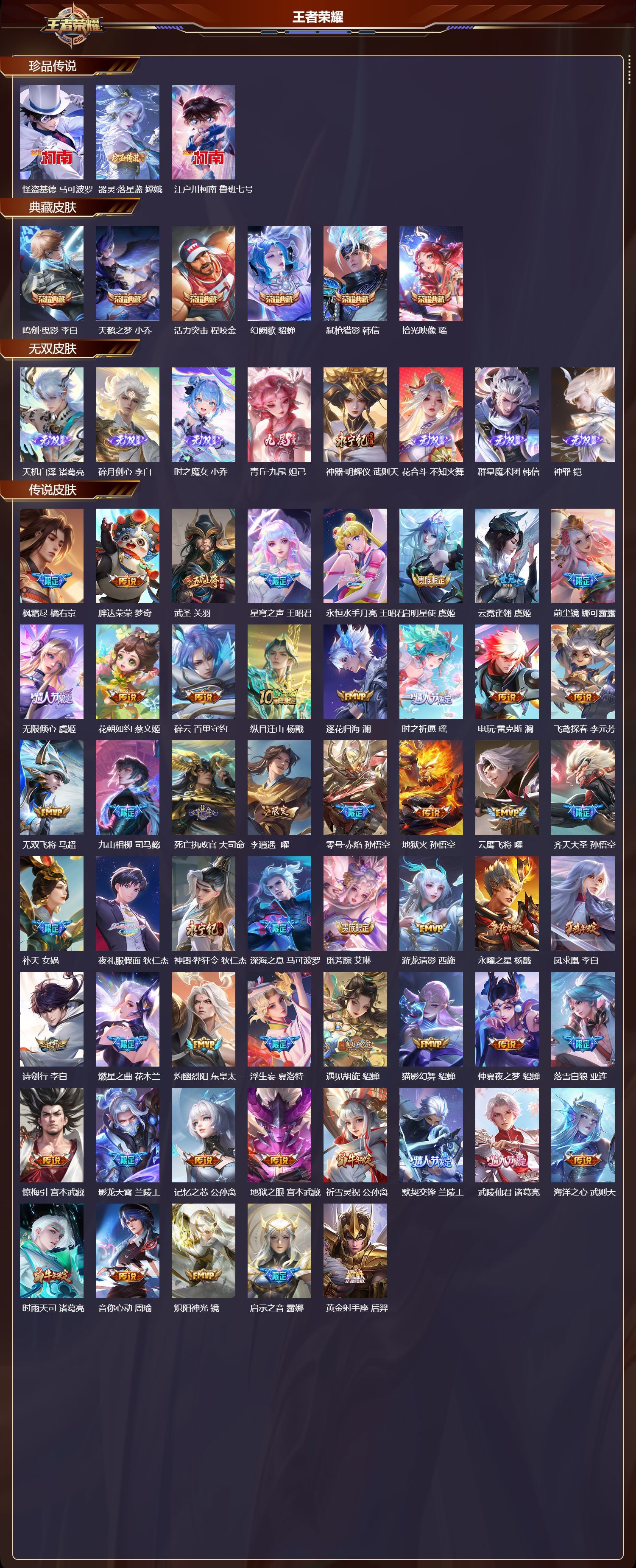 安卓QQ/荣耀王者/647皮肤/127英雄/6典藏/0珍品无双/8无双/3珍品传说/112传说/22