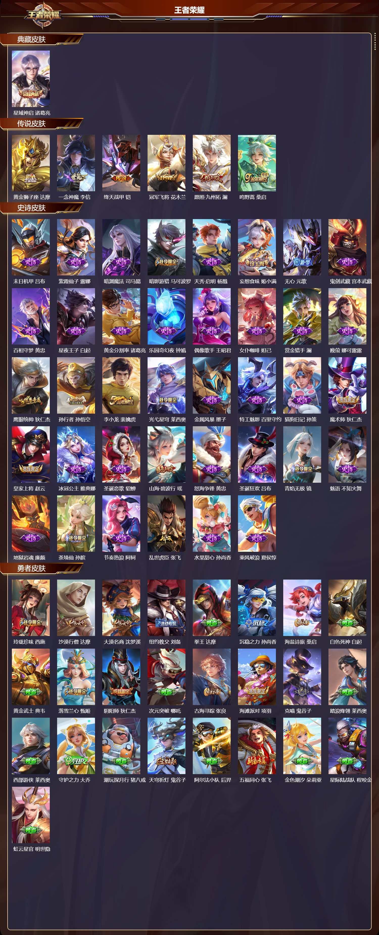安卓QQ/最强王者/146皮肤/125英雄/1典藏/0珍品无双/0无双/0珍品传说/6传说/38史诗