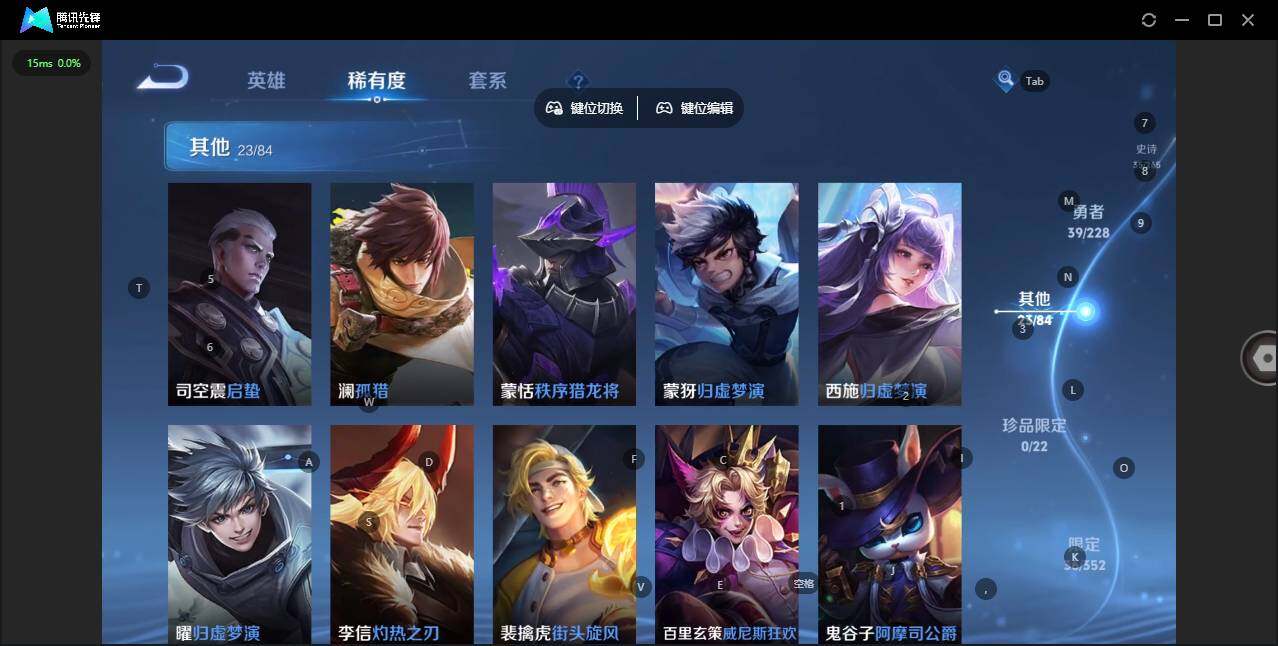 贵族等级: V6 英雄数: 101 皮肤数: 102 星传说: 幽冥之眼 传说皮: 黄金射手座,地狱之眼,淬星耀世 限定皮: 冰锋战神,李小龙,神威,至尊宝,愿照·岁时盈