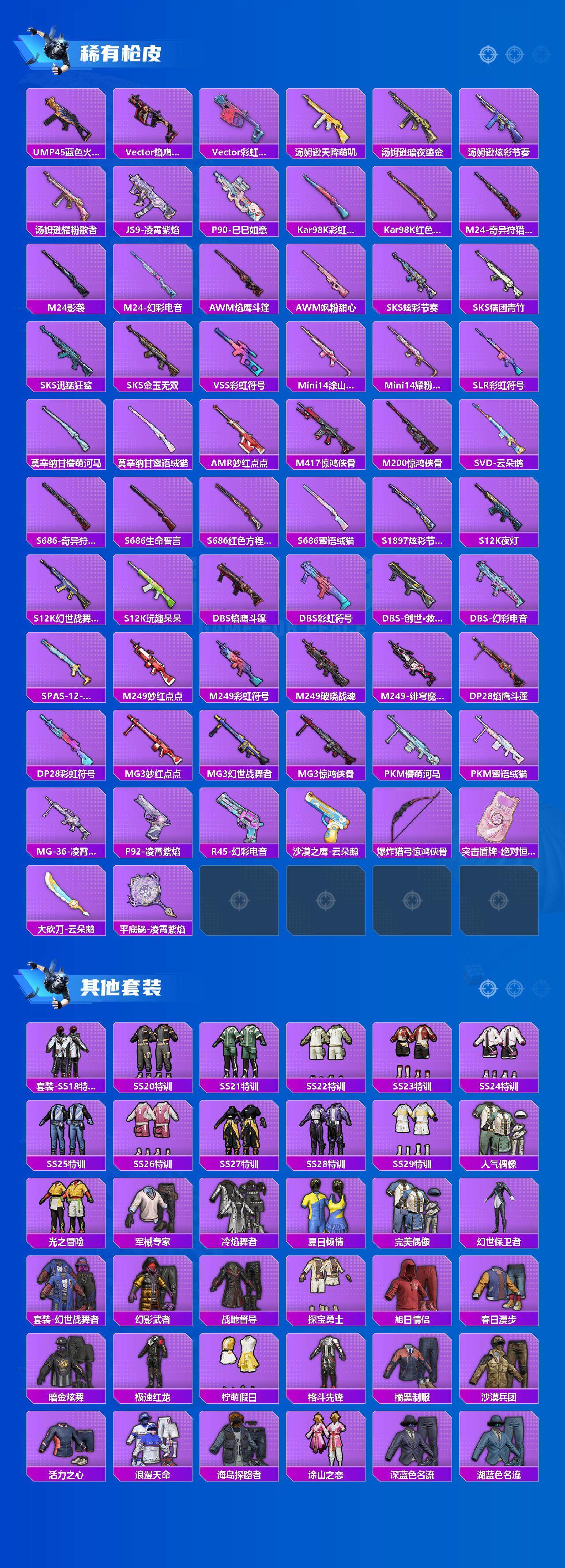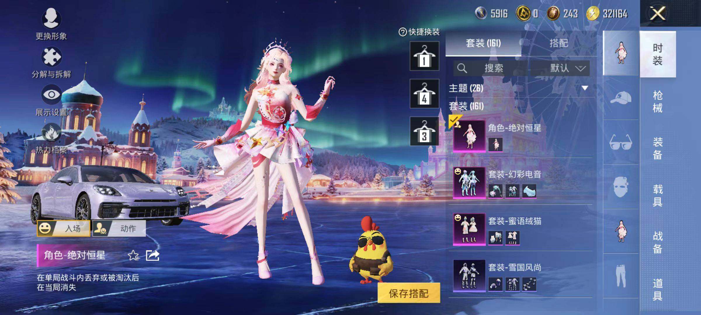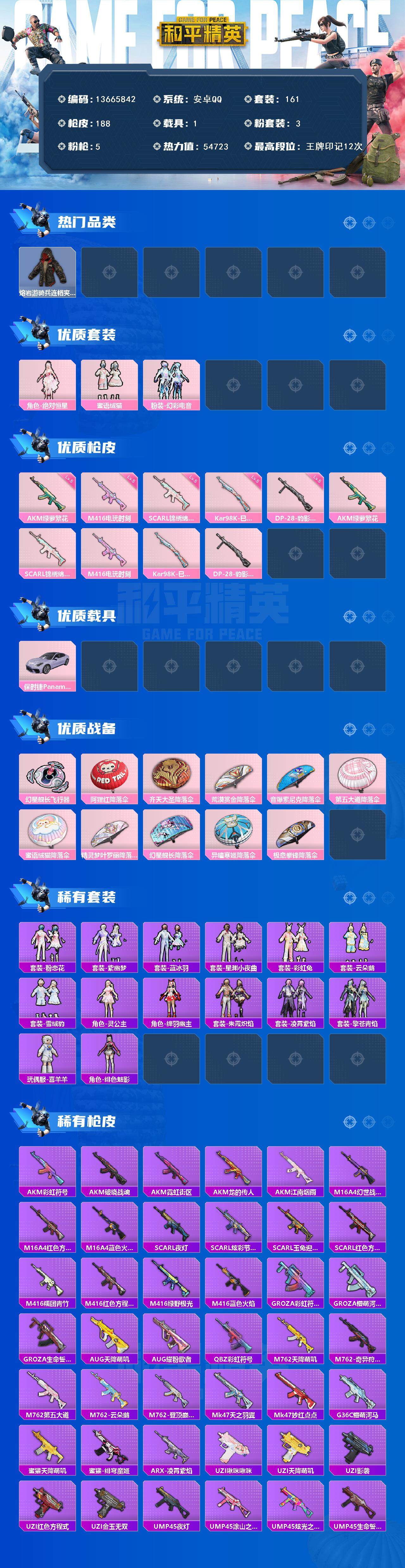 161套装/枪械5/装备198/载具1/战备147/王牌印记12/热力值54723/五级AKM-绿萝繁花/五级SCAR-L-锦绣绵绵/五级M416-电玩时刻/五级Kar98K-巳巳如意/五级DP-28-豹影疾电/套装-浪漫天命/套装-龟仙人/熔岩游骑兵连帽夹克/角色-绝对恒星/蜜语绒猫/粉装-幻彩电音/保时捷Panamera(星辰紫)/AKM-绿萝繁华/SCAR-L-锦绣绵绵/M416-电玩时刻