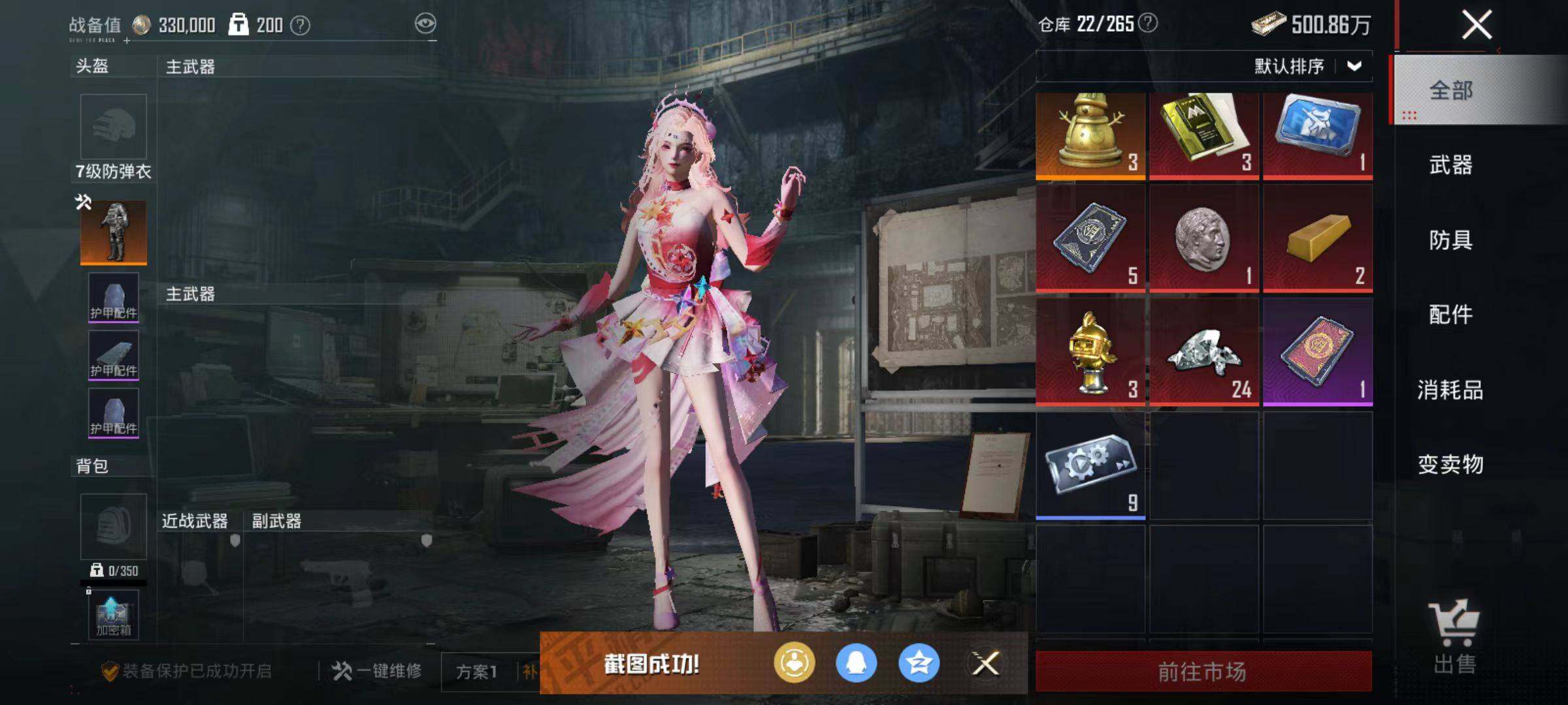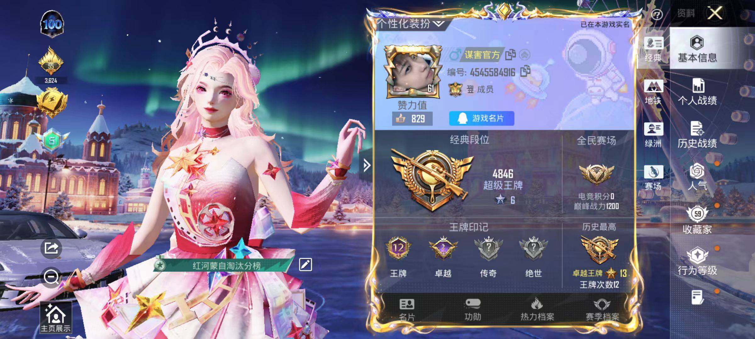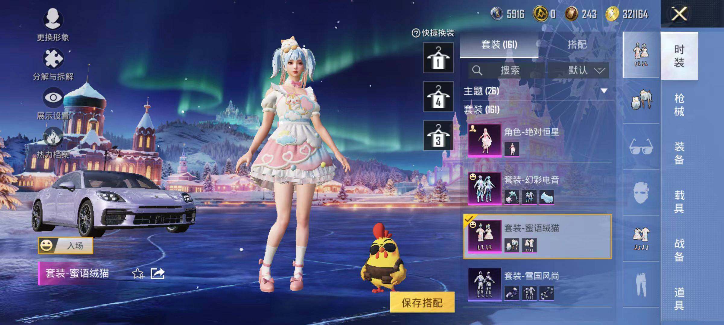 161套装/枪械5/装备198/载具1/战备147/王牌印记12/热力值54723/五级AKM-绿萝繁花/五级SCAR-L-锦绣绵绵/五级M416-电玩时刻/五级Kar98K-巳巳如意/五级DP-28-豹影疾电/套装-浪漫天命/套装-龟仙人/熔岩游骑兵连帽夹克/角色-绝对恒星/蜜语绒猫/粉装-幻彩电音/保时捷Panamera(星辰紫)/AKM-绿萝繁华/SCAR-L-锦绣绵绵/M416-电玩时刻