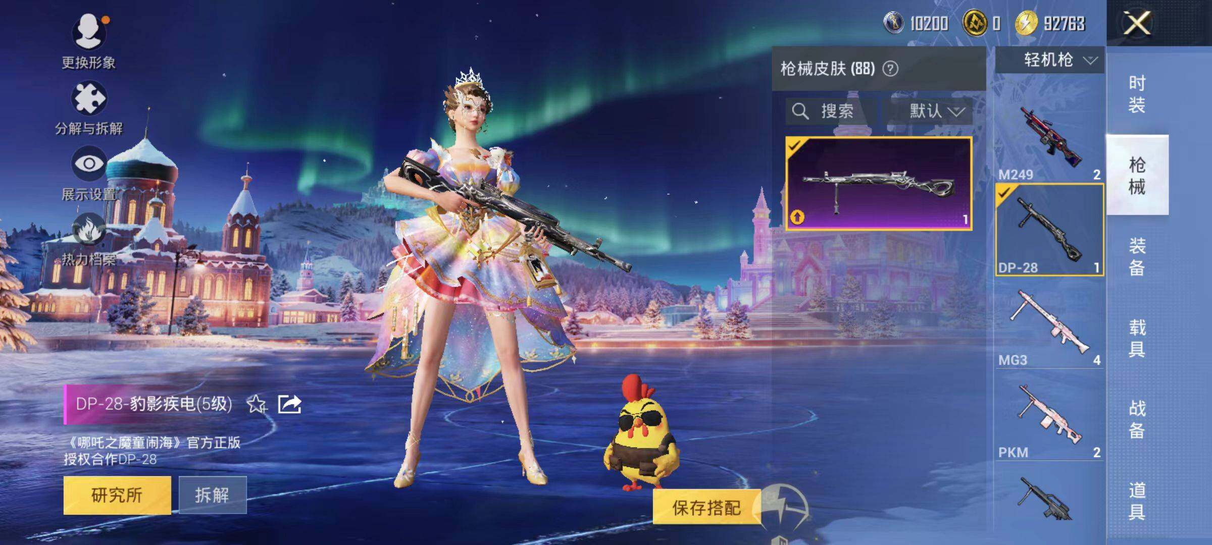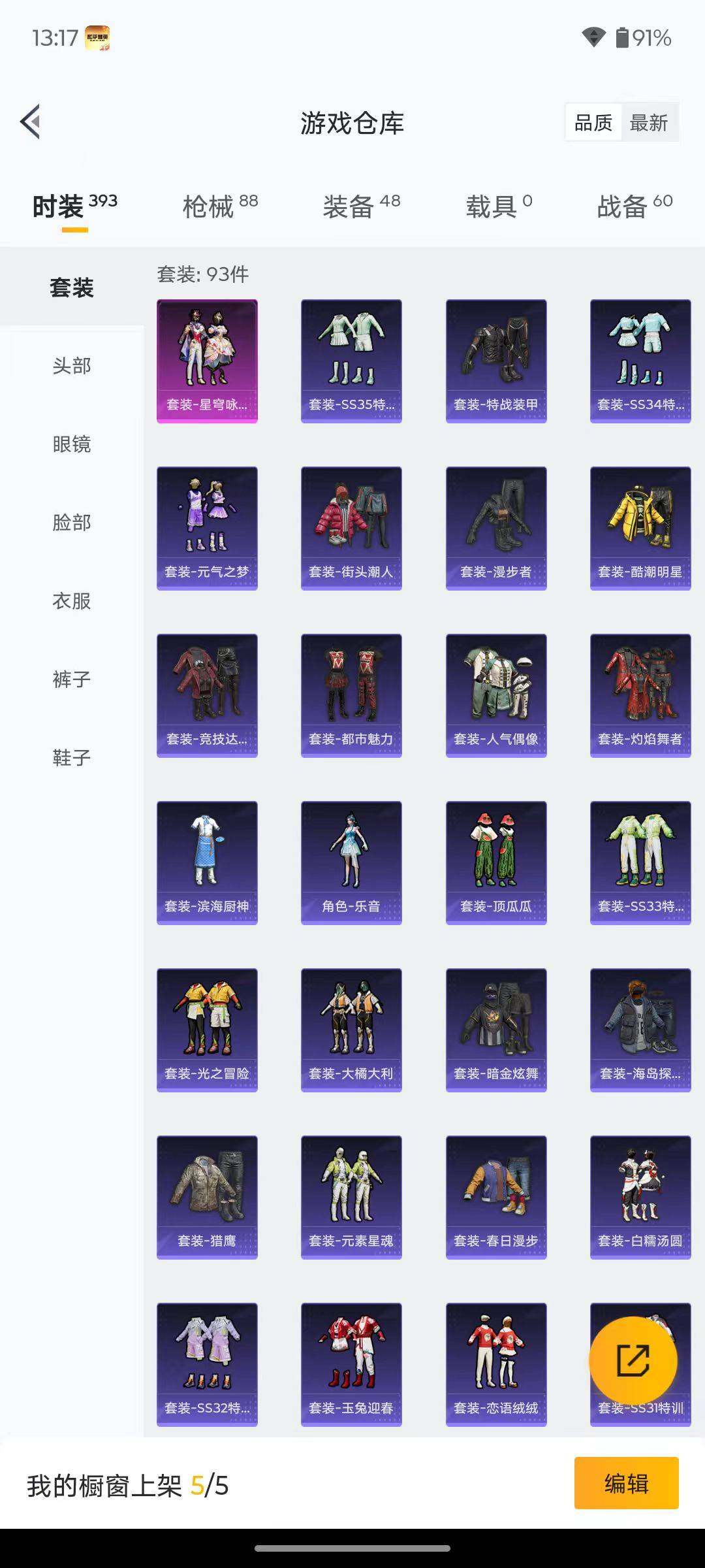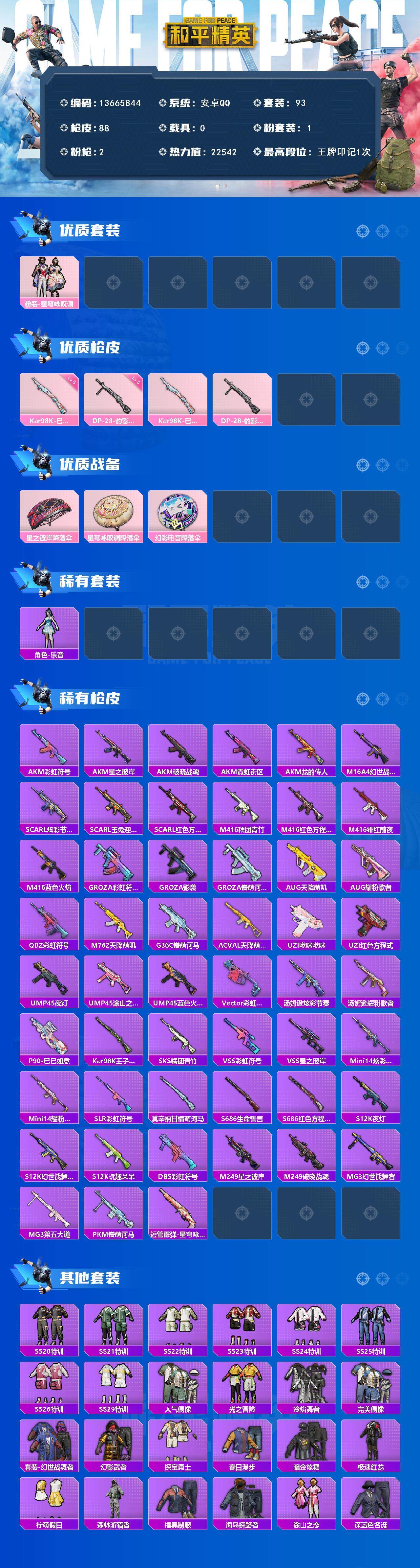 93套装/枪械2/装备48/战备60/王牌印记1/热力值22542/五级Kar98K-巳巳如意/五级DP-28-豹影疾电/套装-龟仙人/粉装-星穹咏叹调/Kar98K-巳巳如意/DP-28-豹影疾电/星之彼岸降落伞/星穹咏叹调降落伞/幻彩电音降落伞/龟仙人/角色-乐音/AKM-彩虹符号/AKM-星之彼岸/AKM-破晓战魂/AKM-霓虹街区/AKM-龙的传人/M16A4-幻世战舞者/SCAR-L-