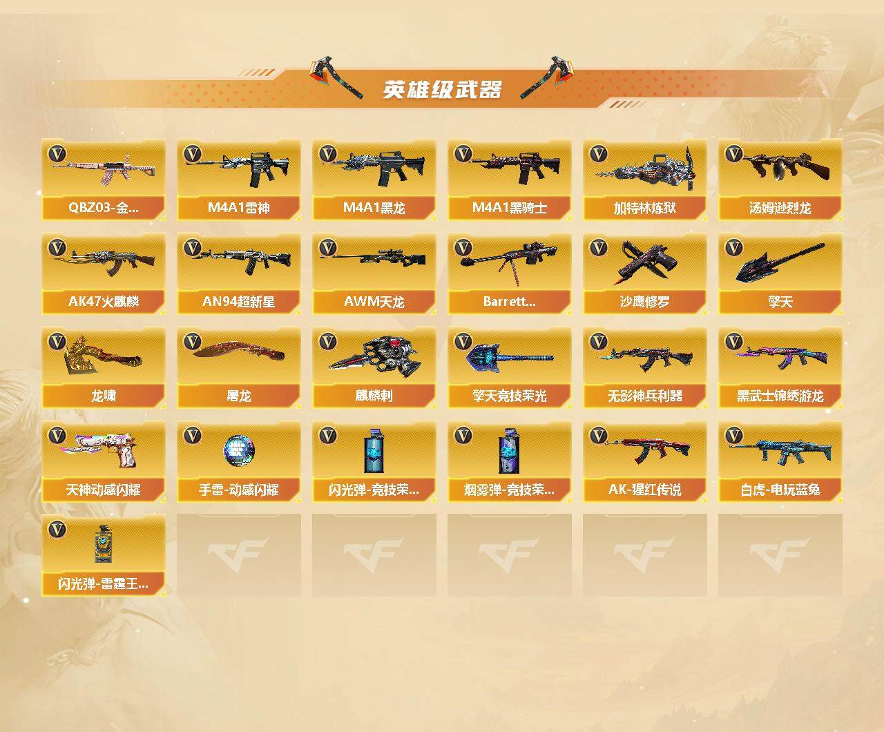 【热门武器】:传说暗裔,QBZ03-金色蔷薇,死亡之眼,白虎-电玩蓝兔,M4A1-黑骑士,汤姆逊-烈龙,加特林-炼狱,斯泰尔-蝴蝶,沙鹰-修罗*2