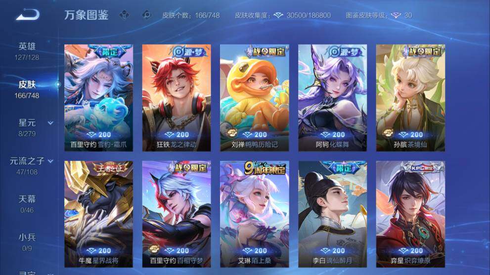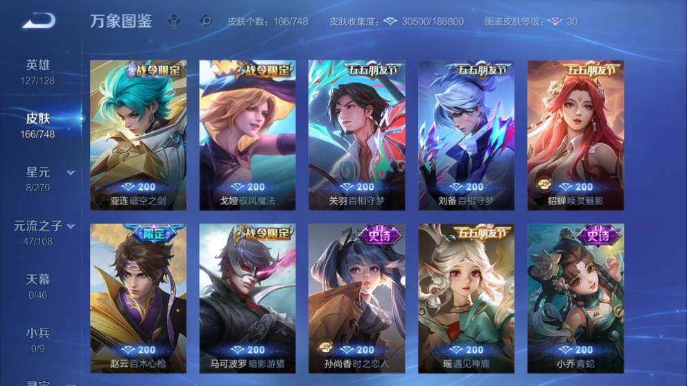 安卓WX-V7-166皮肤-1典藏皮肤-1无双-4珍品传说-14传说-57史诗-2星传说-9按键