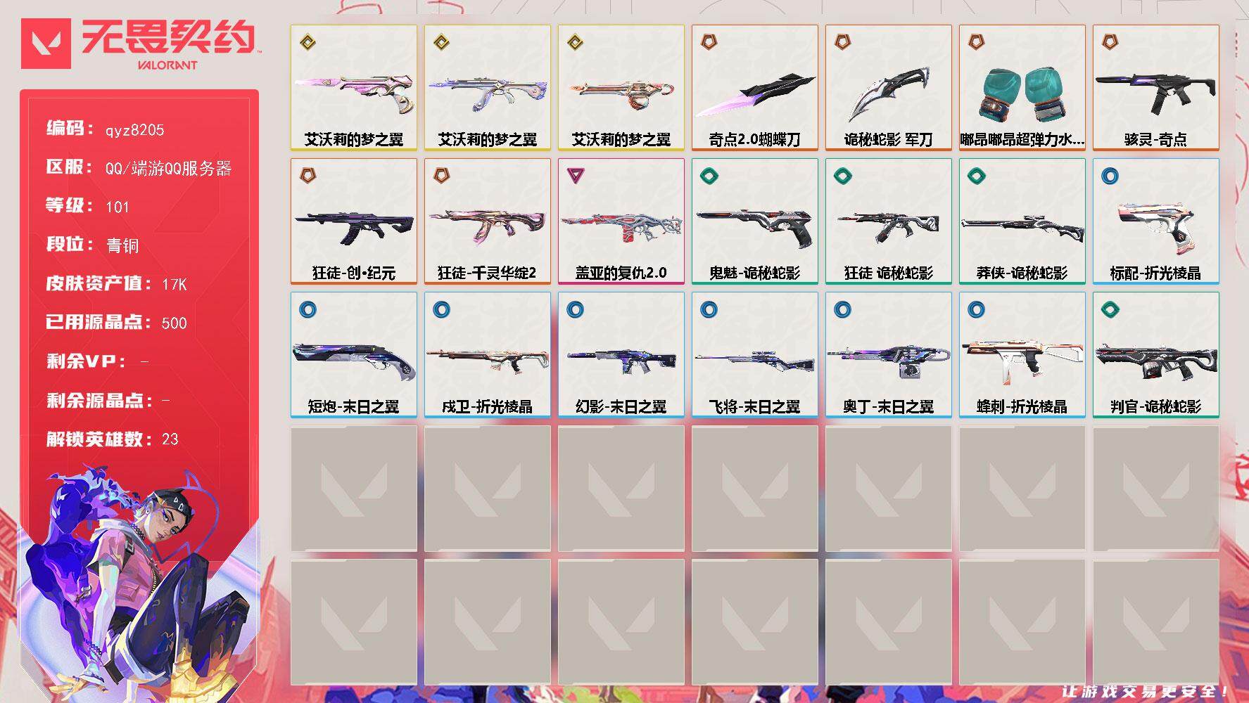 【qyz8205】艾沃莉的梦之翼 狂徒 奥丁 鬼魅 砰砰拳套 莲华创纪元狂徒 奇点蝴蝶刀 骇灵 qyz8205 近战武器皮肤: 蝴蝶刀-奇点//2.0,诡秘蛇影 步枪皮肤: 幻影-盖亚的复仇2.0,狂徒-艾沃莉的梦之翼,狂徒-创·纪元,狂徒-千灵华绽//2.0 佩枪皮肤: 鬼魅-艾沃莉的梦之翼 冲锋枪皮肤: 骇灵-奇点 机枪皮肤: 奥丁-艾沃莉的梦之翼 亮点: 【qyz8205】【英雄】:幻棱,炼狱,暮蝶,壹决,铁臂,捷风,雷兹,幽影,不死鸟,贤者,猎枭,蝰蛇,芮娜,奇乐,尚勃勒,霓虹,斯凯,