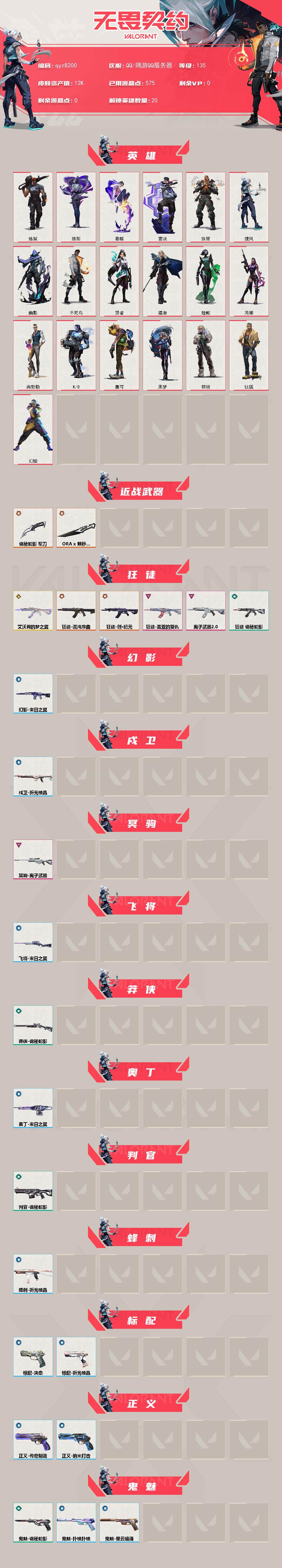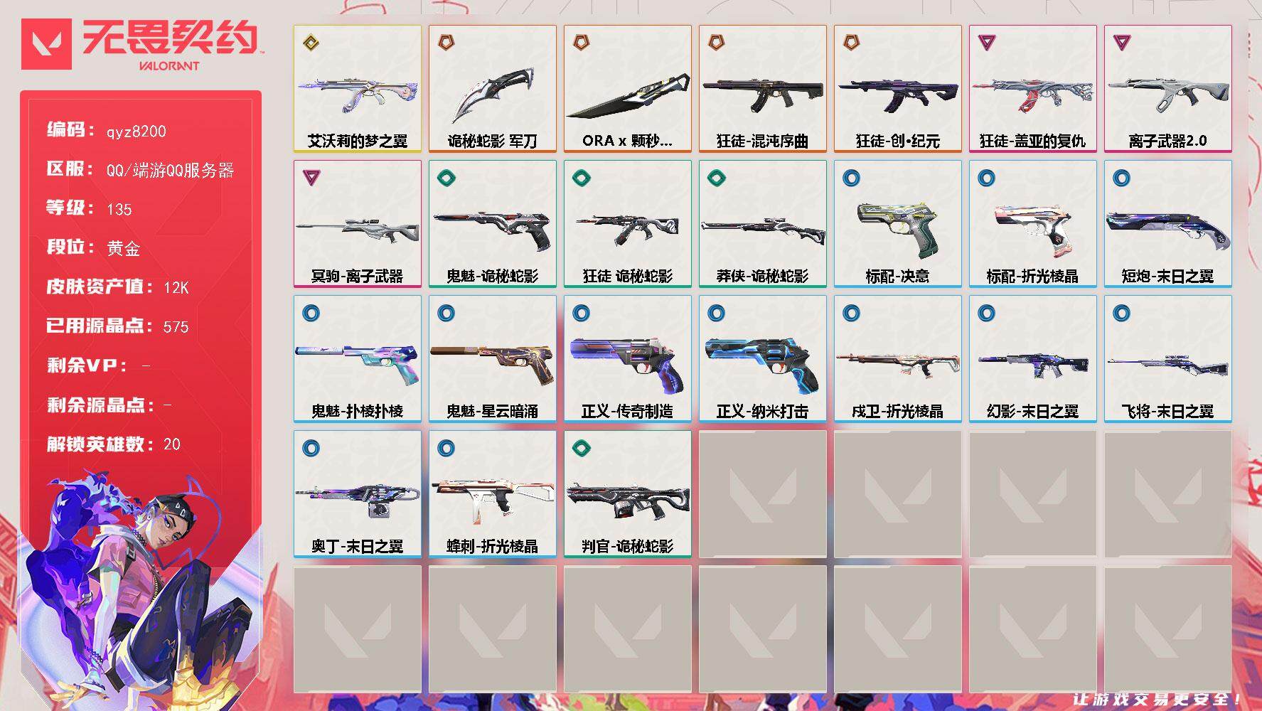 【qyz8200】艾沃利的梦之翼 创纪元 离子混沌盖亚狂徒 离子冥驹 颗秒刀 qyz8200 近战武器皮肤: 诡秘蛇影 步枪皮肤: 狂徒-盖亚的复仇,狂徒-艾沃莉的梦之翼,狂徒-混沌序曲,狂徒-创·纪元,狂徒-离子武器2.0 狙击枪皮肤: 冥驹-离子武器 亮点: 【qyz8200】【英雄】:幻棱,炼狱,维斯,暮蝶,钛狐,壹决,铁臂,捷风,幽影,不死鸟,贤者,猎枭,蝰蛇,芮娜,尚勃勒,K/O,盖可,黑梦,钢锁【近战武器】:近战武器-ORA x 颗秒 军刀,近战武器-诡秘蛇影 军刀【狂徒】:狂徒-