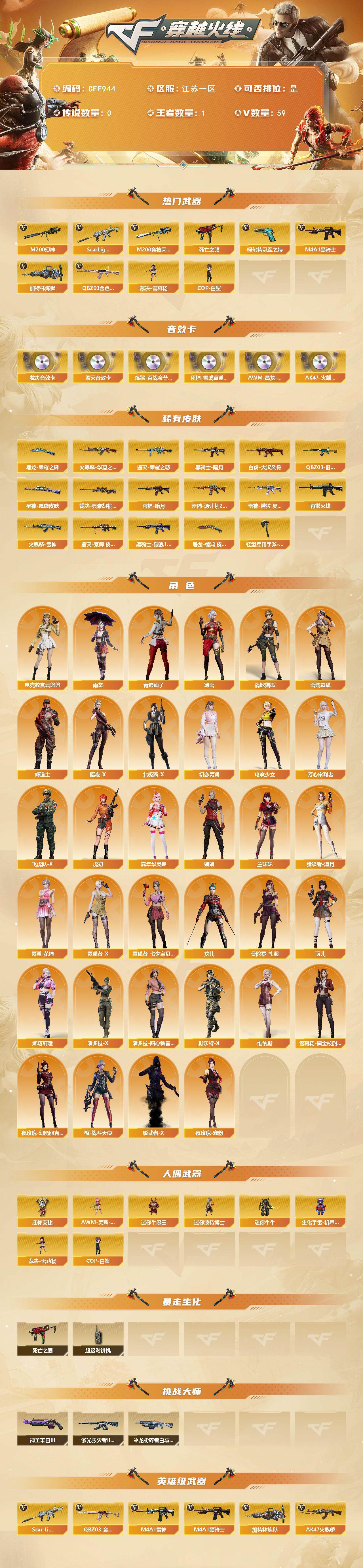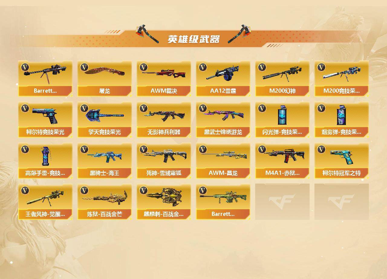 【CFF944】54V/100级/元帅/1王者/5英雄/QBZ03-金色蔷薇/scar_白虎/M200_幻神/M200_竞技荣光/死亡之眼/柯尔特-冠军之特/M4A1_黑骑士/加特林_炼狱/裁决-雪莉杨/COP-白鲨/Barrett-毁灭音效卡/AWM-裁决音效卡/炼狱-百战金芒-庆典舞曲音效卡/死神-雪域霜狐-怀旧音效卡/AWM-昌龙-怀旧音效卡/AK47-火麒麟-怀旧音效卡/白虎-大汉风骨/QBZ03-冠军之薇/裁决-典雅胡桃 皮肤/星神-璀璨皮肤/雷神-暗月/雷神-源计划2.0专属 皮肤/