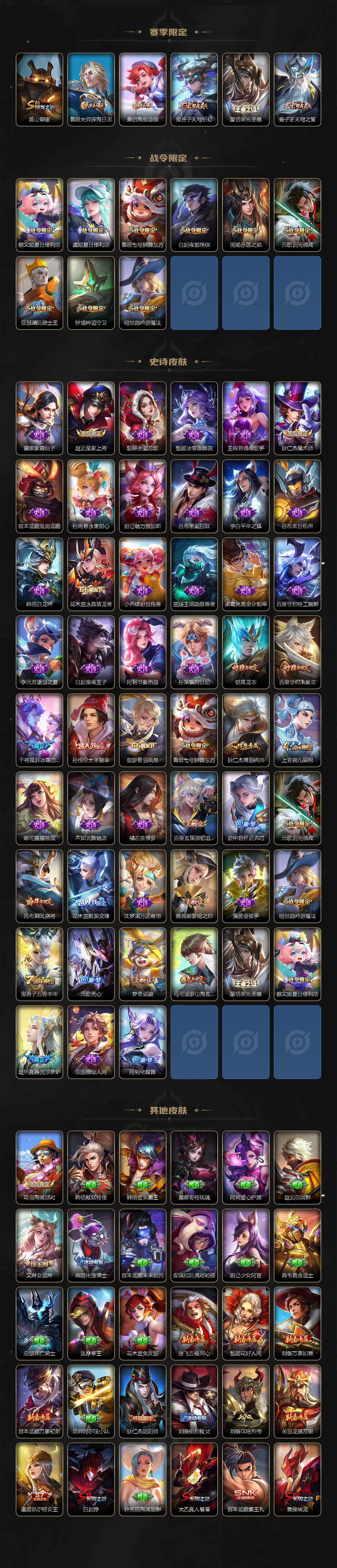 【限定皮肤】:白起狰,蔡文姬夏日便利店,虞姬夏日便利店,姜子牙天穹之誓,狄仁杰阴阳师,虞姬凯尔特女王,赵云皇家上将,鲁班七号狮舞东方,白起