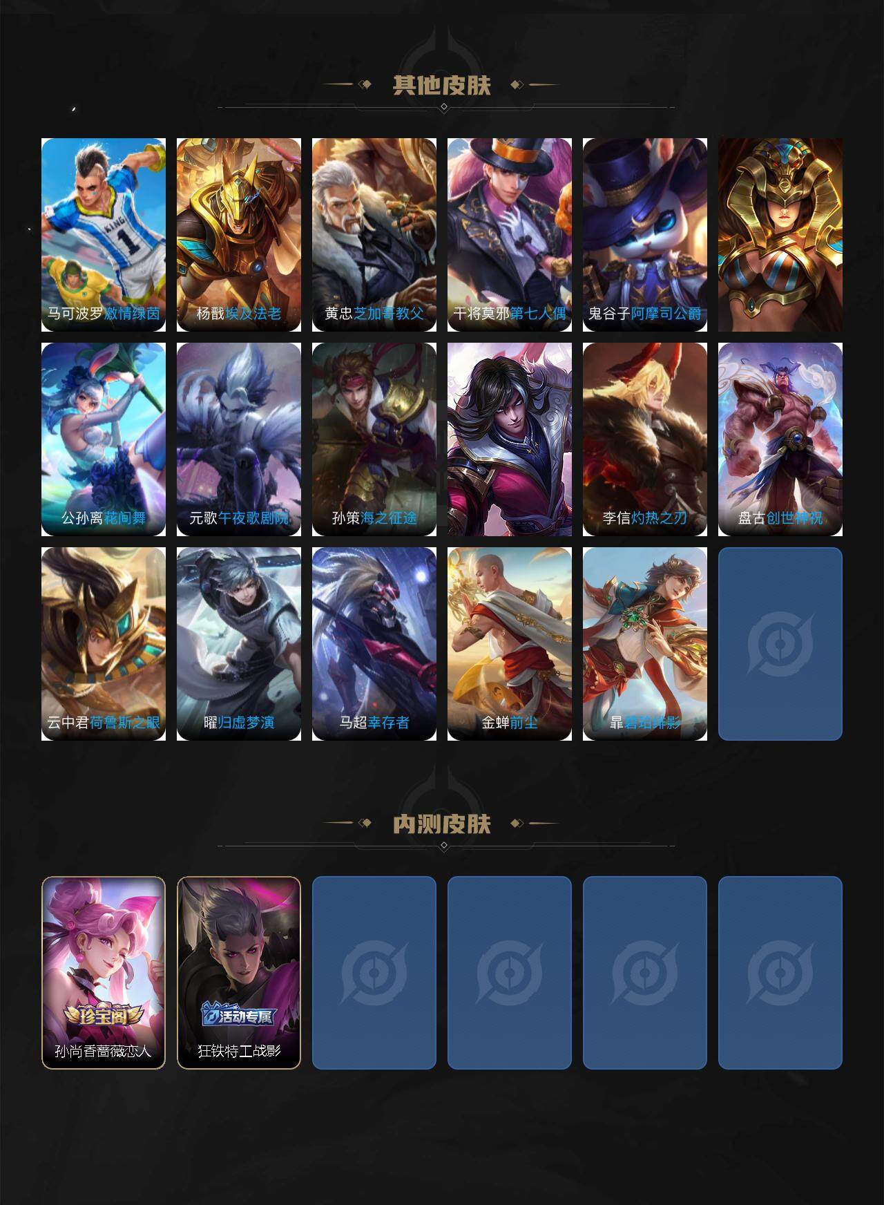 【限定皮肤】:白起狰,姜子牙天穹之誓,狄仁杰阴阳师,赵云皇家上将,孙尚香蔷薇恋人,庄周高山流水,芈月重明,元歌无心,夏侯惇朔风刀,曹操烛龙,典