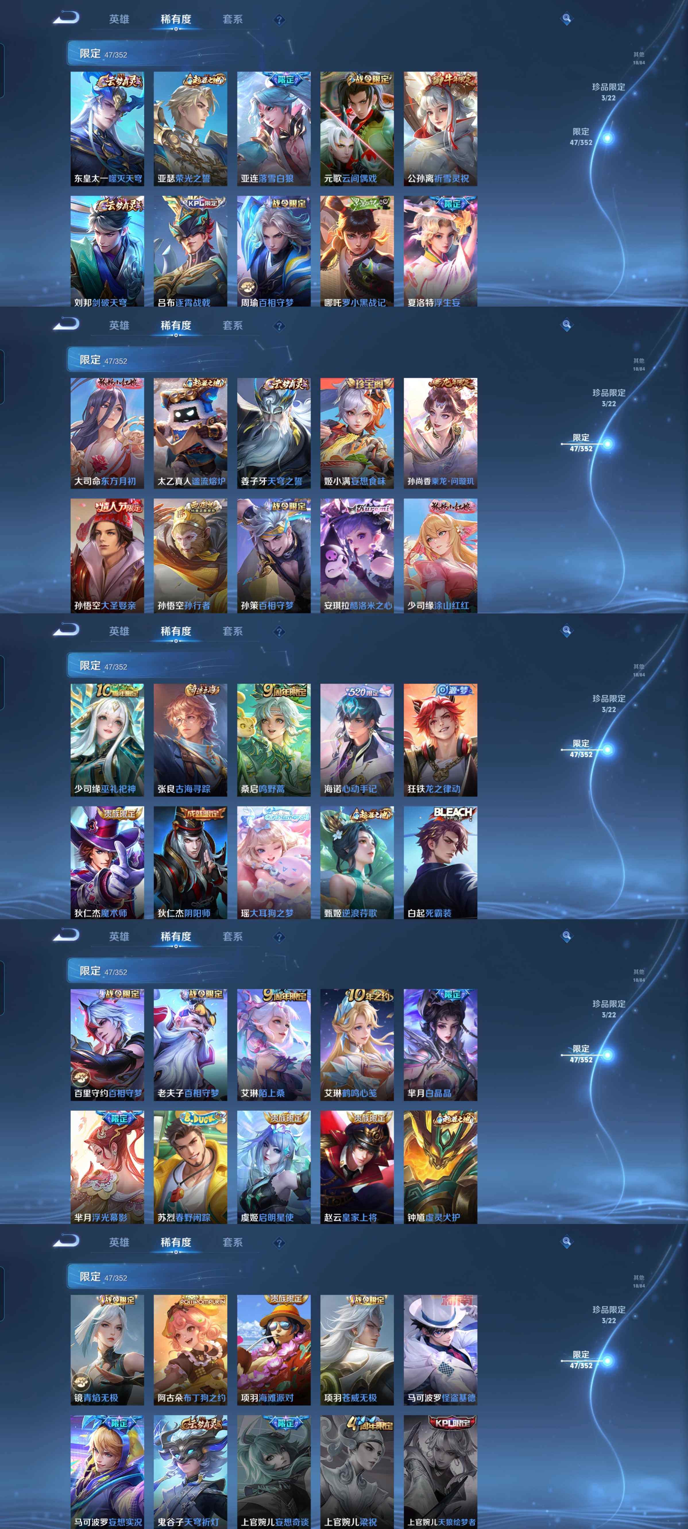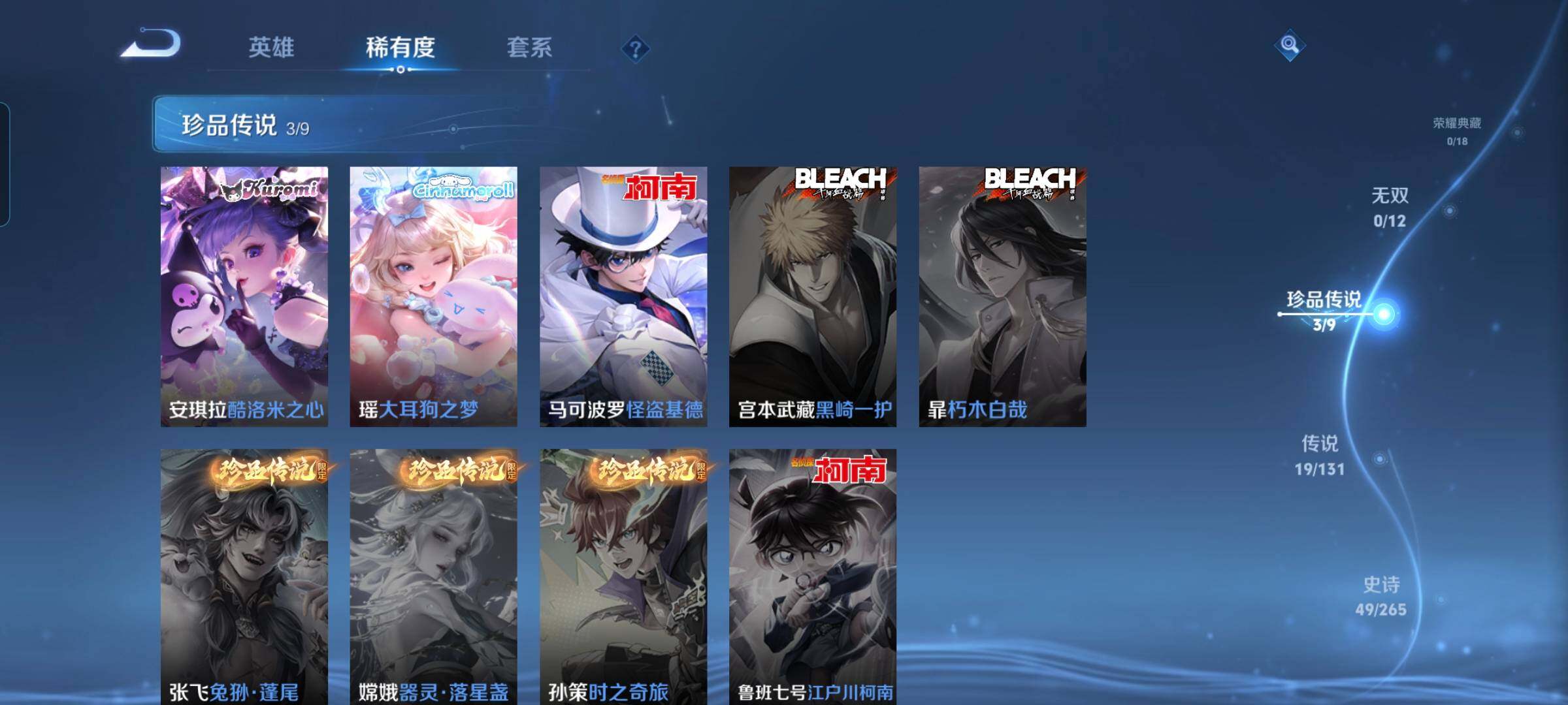 皮肤145 英雄123 永恒钻石 珍品传说3 传说19 其他皮肤54-y03女号,245积分22传说3珍品传说酷洛米之心大耳狗之梦怪盗基德,乘龙问璇