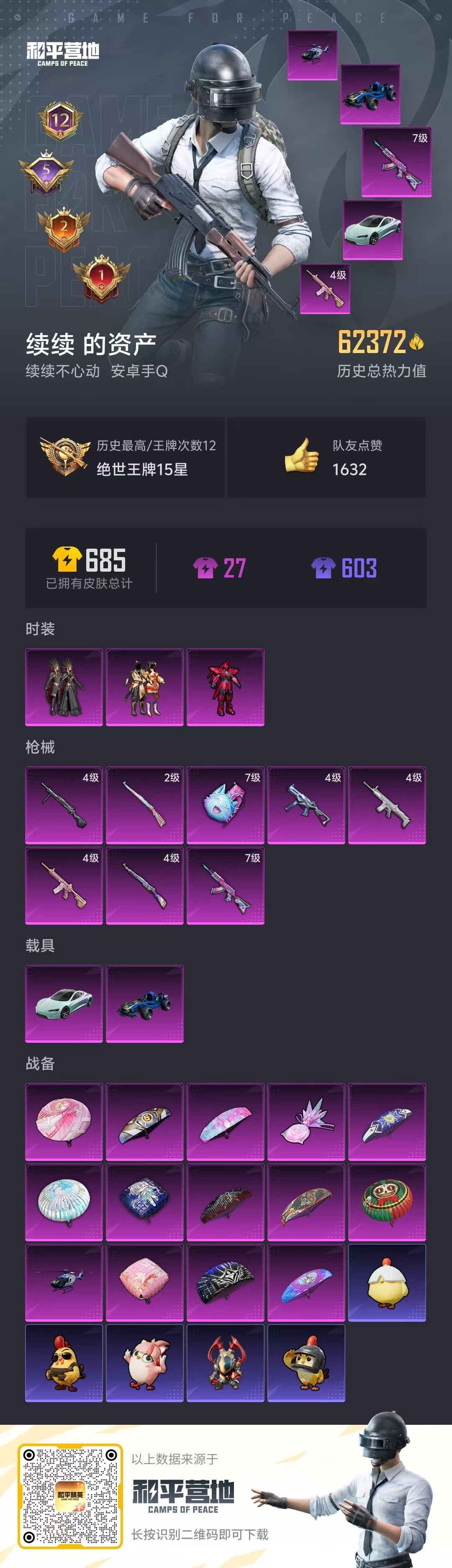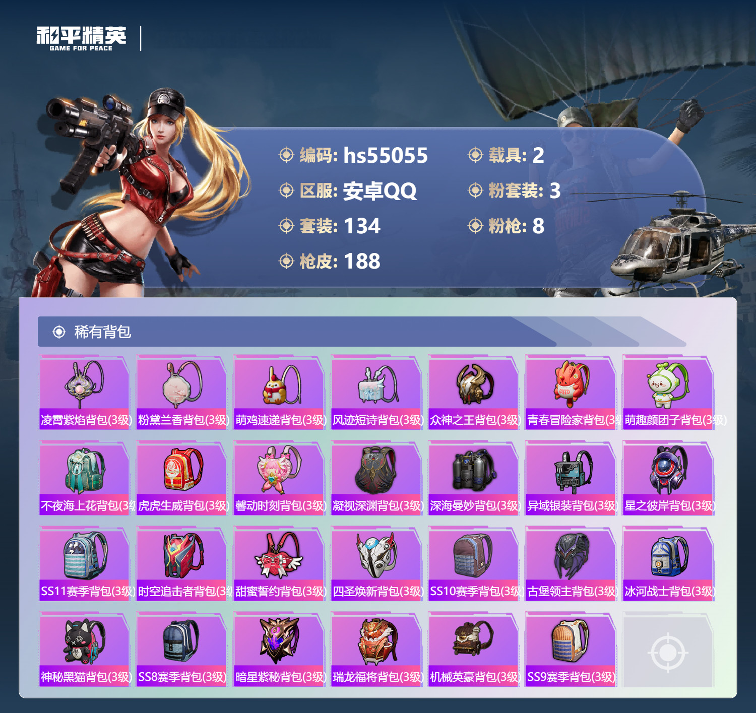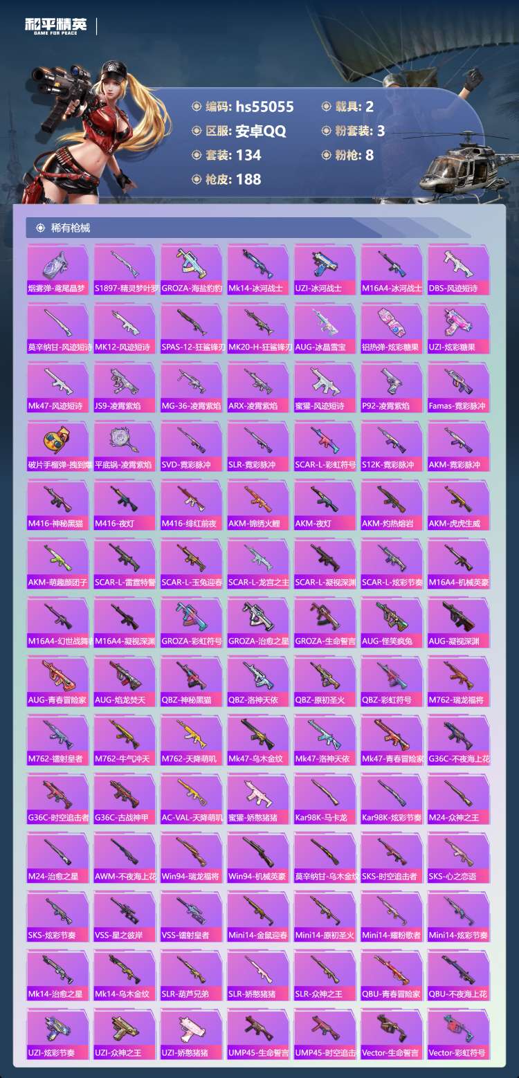 hs55055 安卓手Q-12王牌印记-3粉装-8特效枪-2载具-62372热力值-134套装-18
