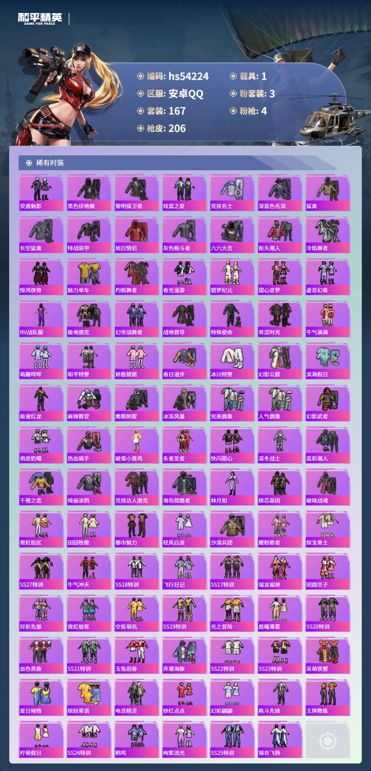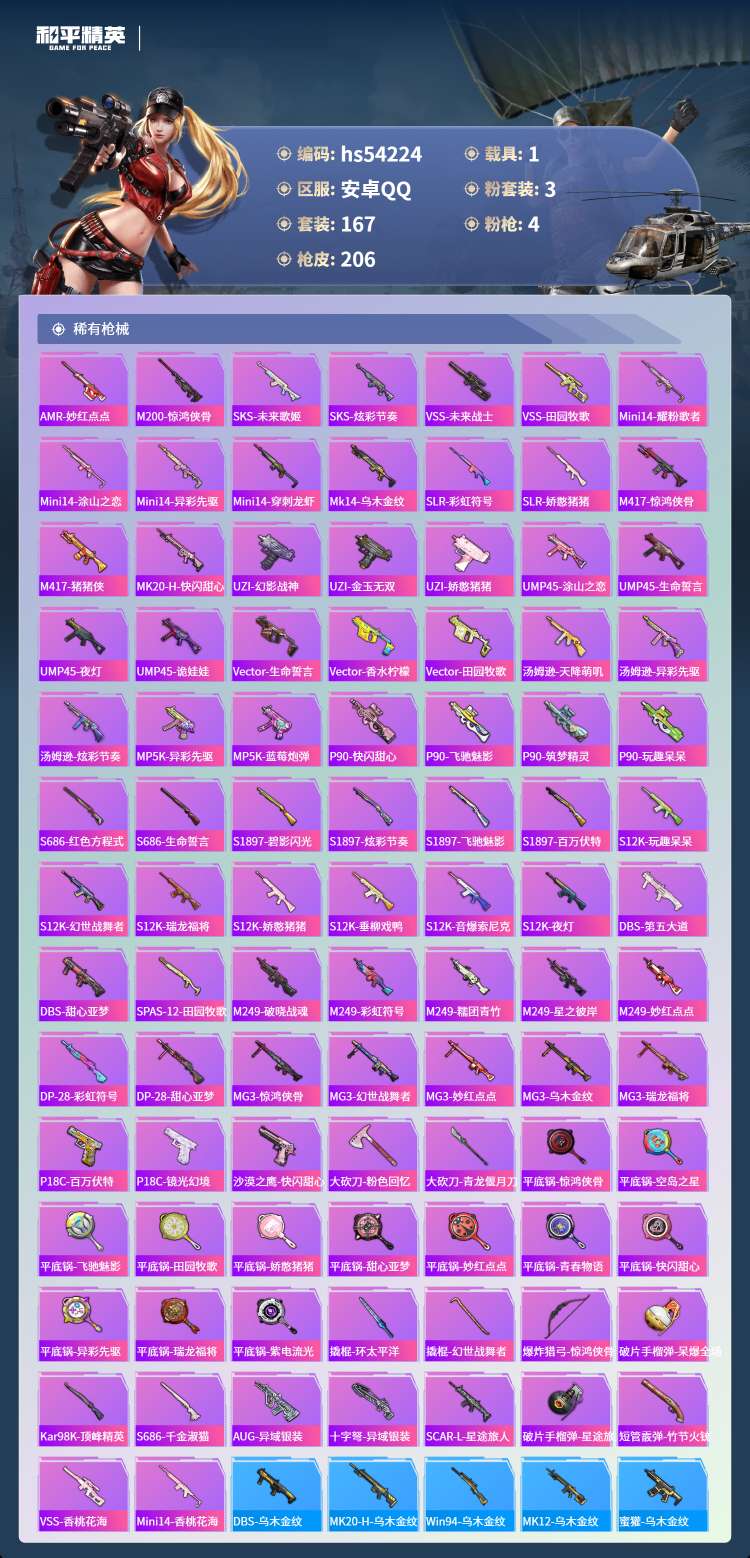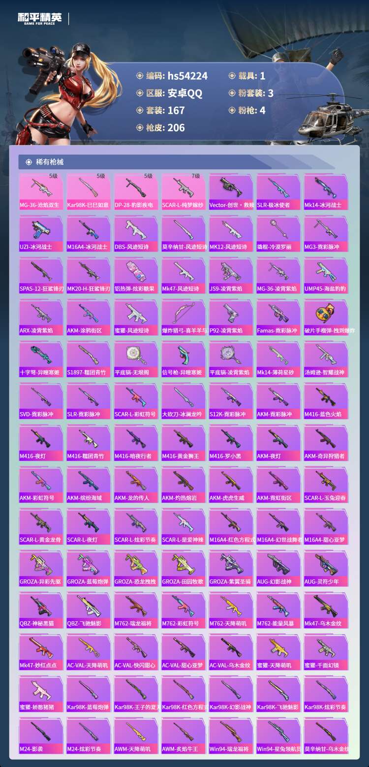 hs54224 安卓手Q-11王牌印记-3粉装-4特效枪-1载具-60248热力值-167套装-20