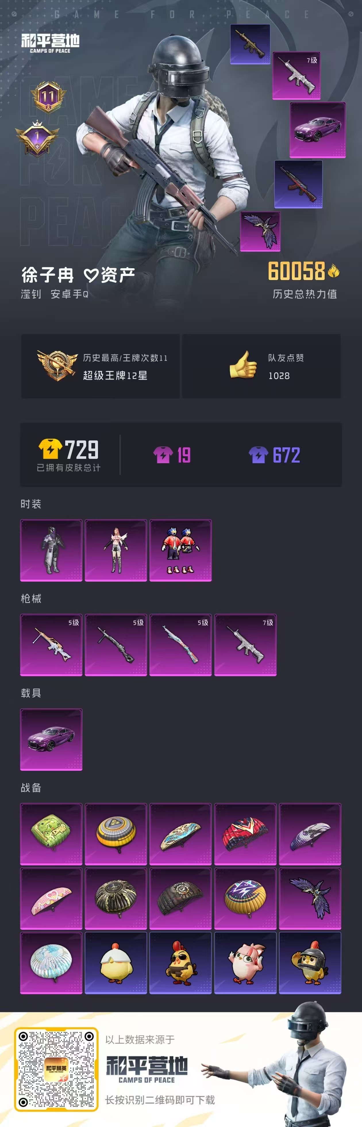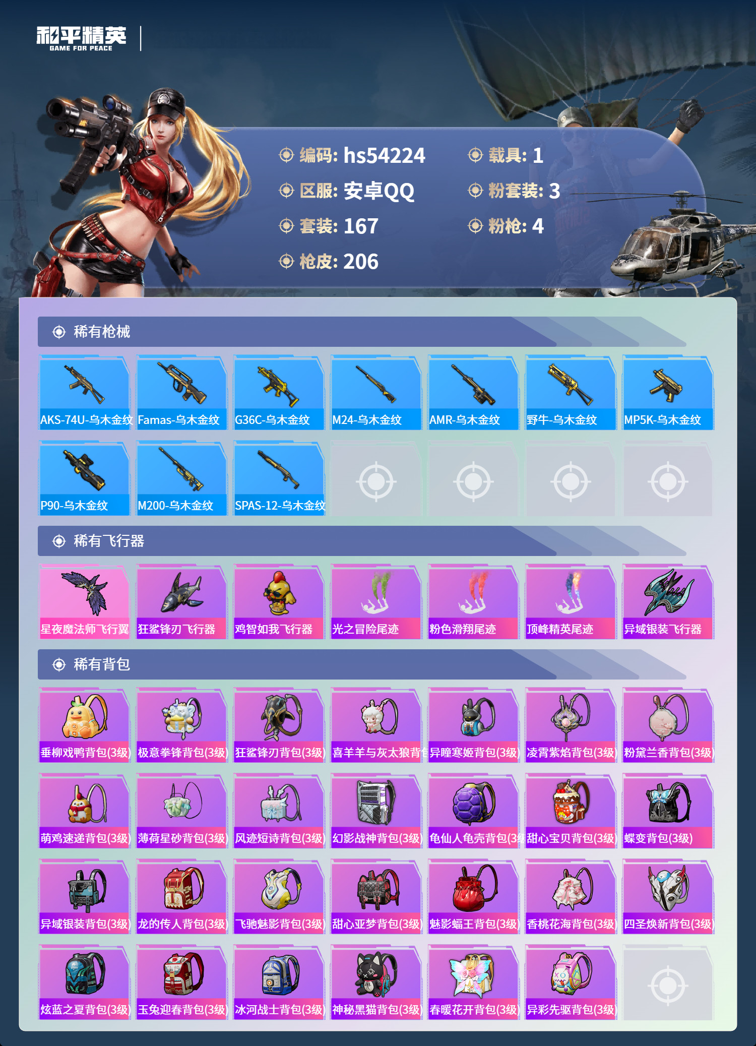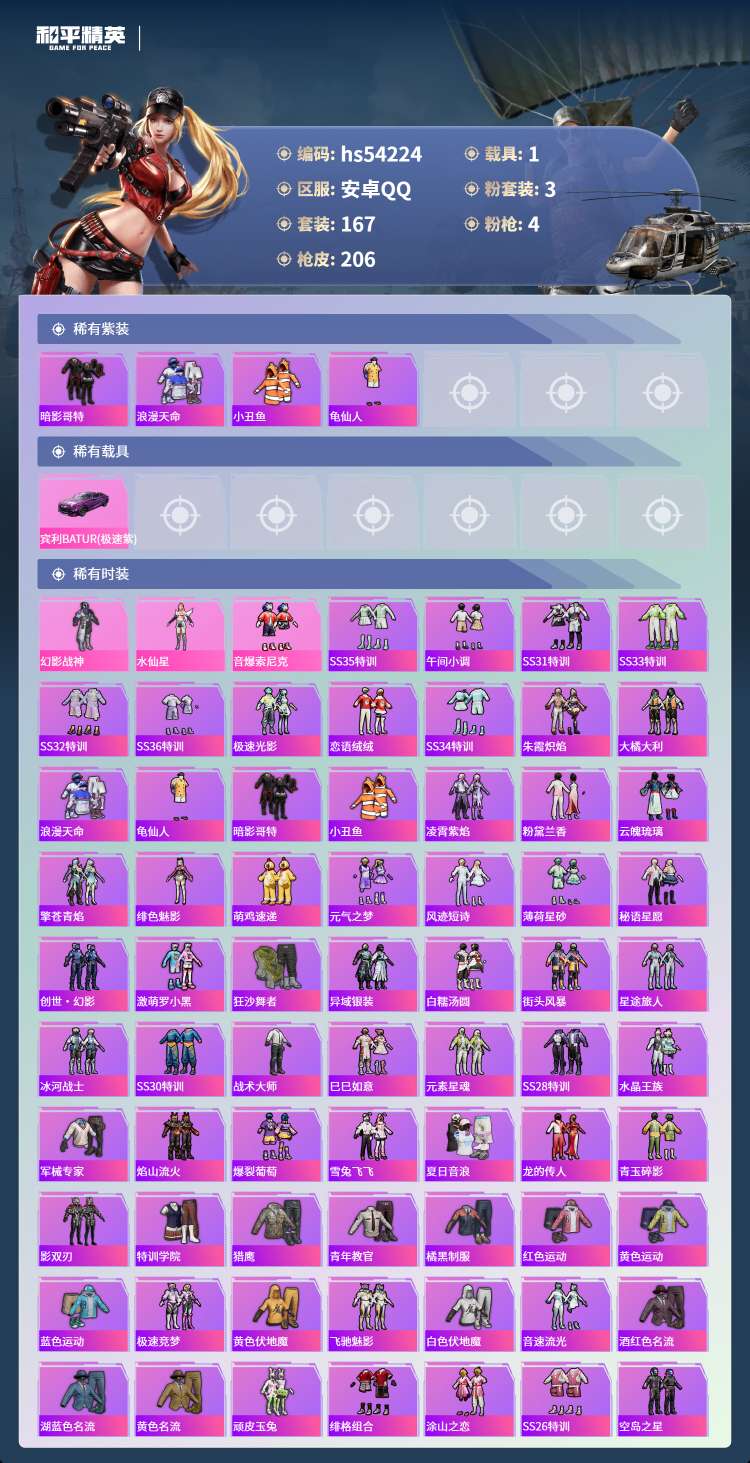 hs54224 安卓手Q-11王牌印记-3粉装-4特效枪-1载具-60248热力值-167套装-20