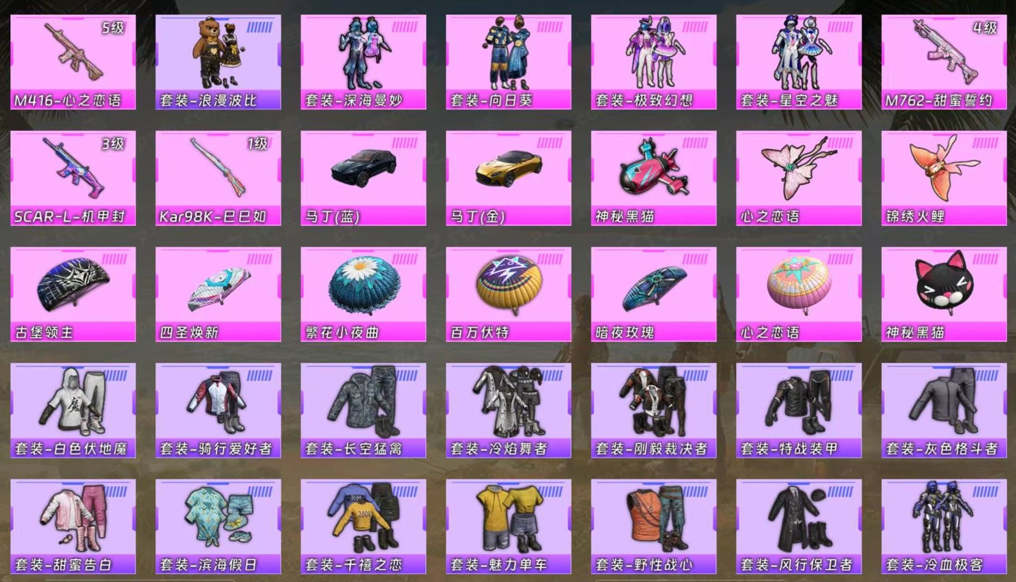 (连体和平精英 浪漫波比 深海曼妙 向日葵 极致幻想 星空之魅 心之恋语 甜蜜誓约 机甲封神 巳巳如意 阿斯顿·马丁(蓝) 阿斯顿·马丁(金) 神秘黑猫飞行器 心之恋语飞行翼 锦绣火鲤飞行器 百万伏特背包)