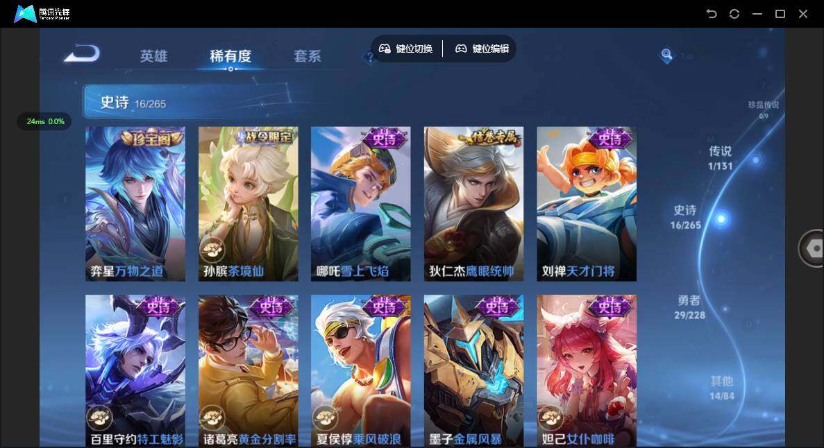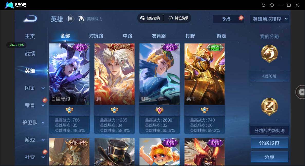 贵族等级: V4 英雄数: 97 皮肤数: 60 限定皮: 愿照·九州拓