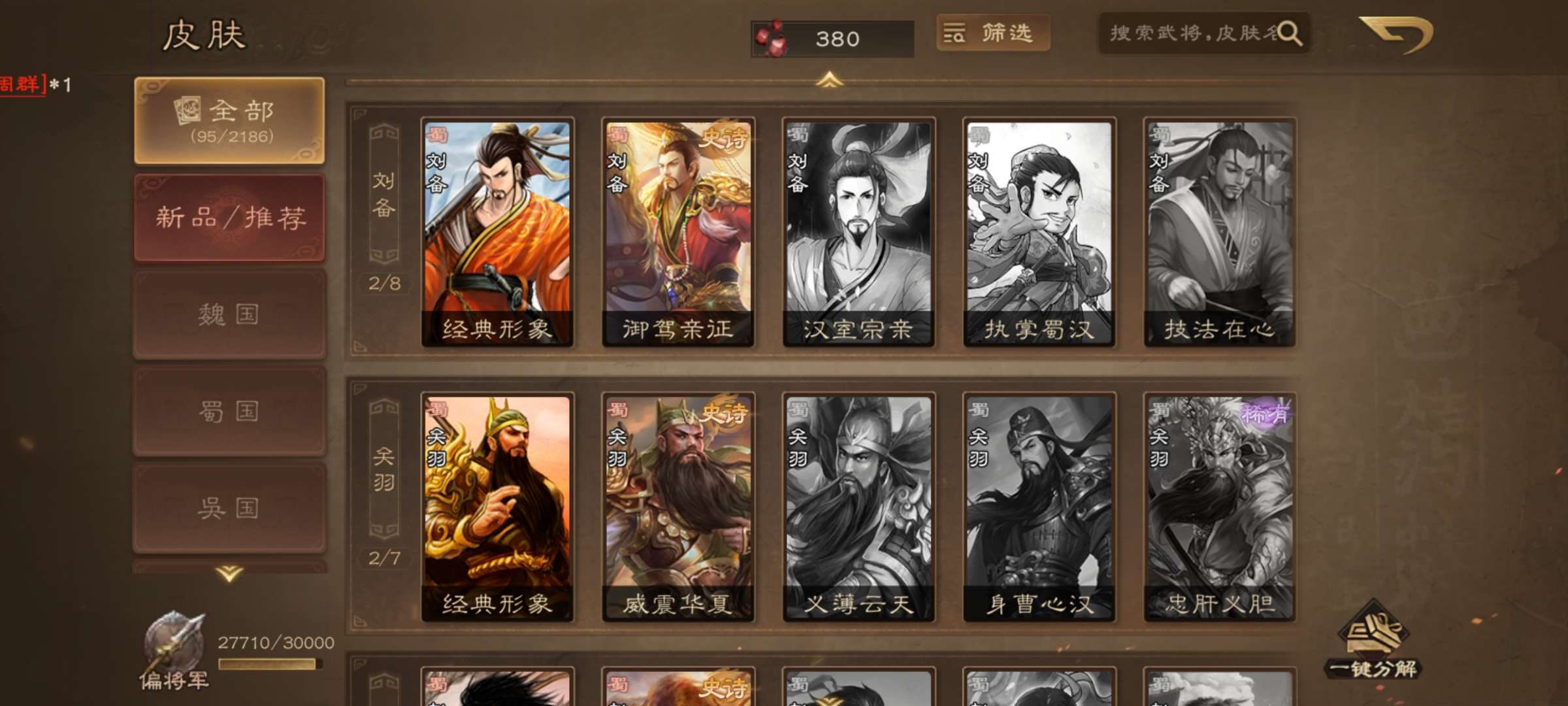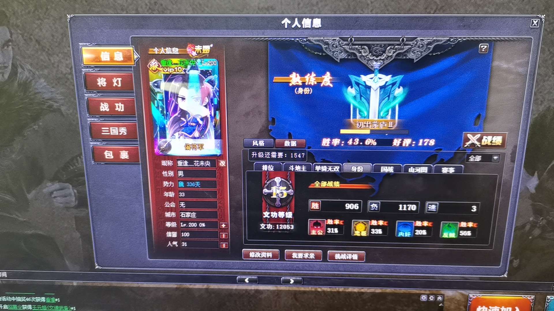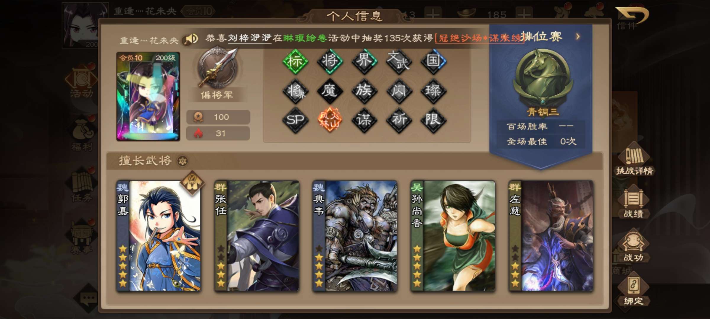 武将二百多 多数都是国战武将 皮肤大多都是限定 传说 史诗 会员是满级