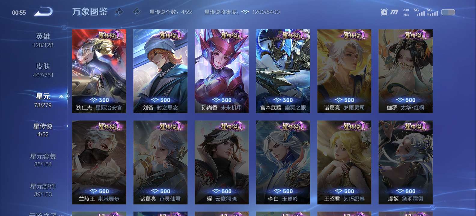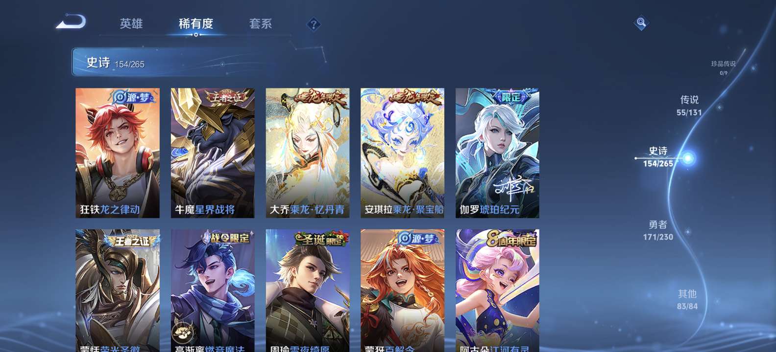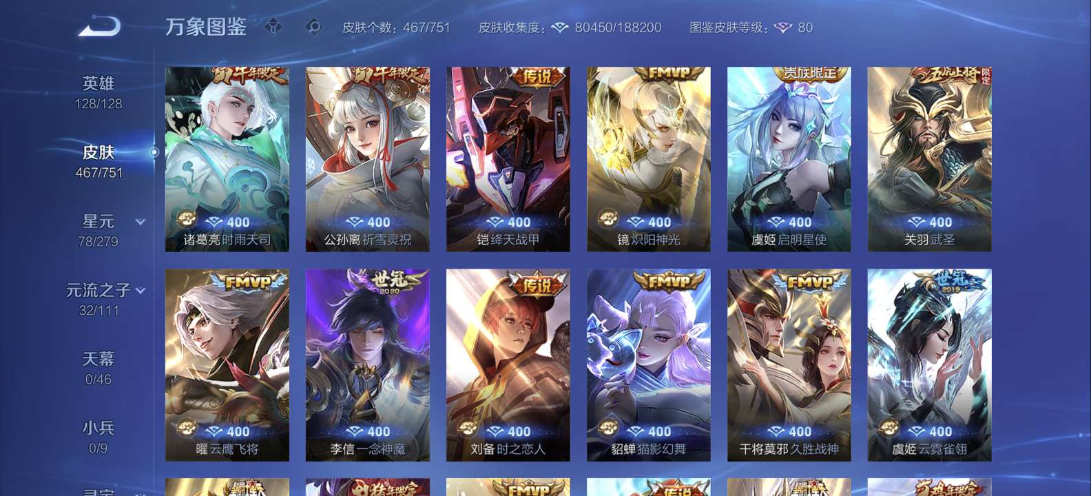 皮肤467 英雄128 荣耀王者 荣耀典藏4 无双皮肤1 珍品传说1 传说55 其他皮肤192-打野