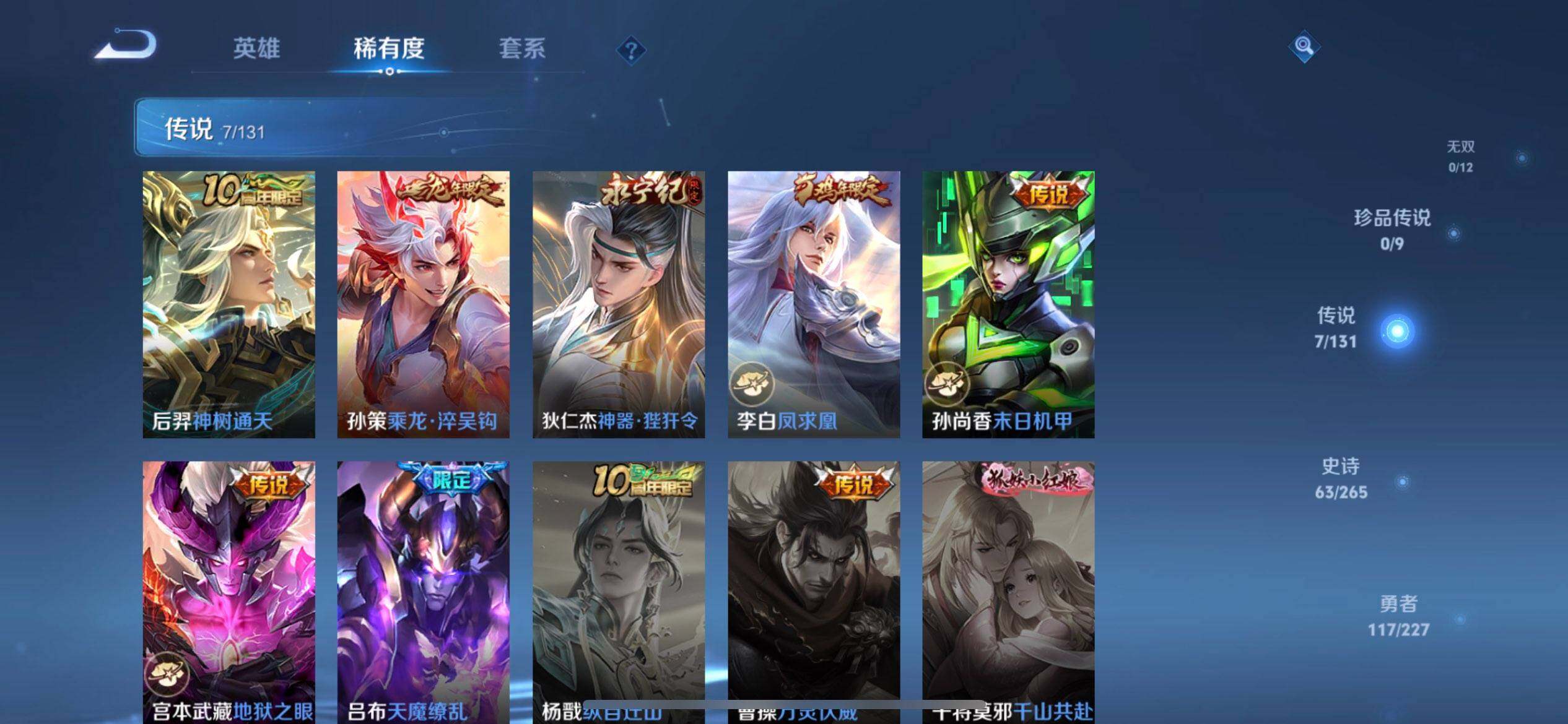 【传说皮肤】:后羿神树通天,孙策乘龙淬吴钩,狄仁杰神器狴犴令,李白凤求凰,孙尚香末日机甲,宫本武藏地狱之眼,吕布天魔缭乱