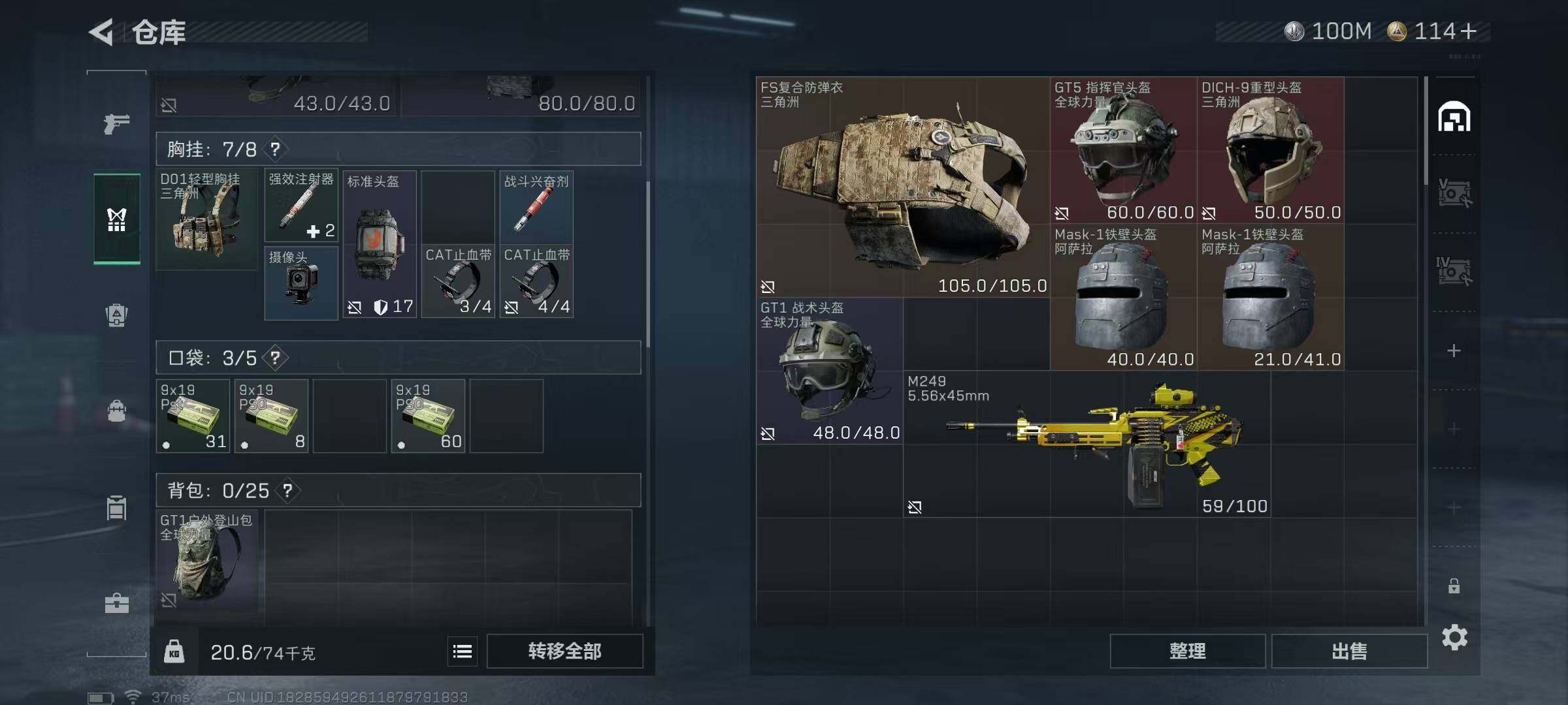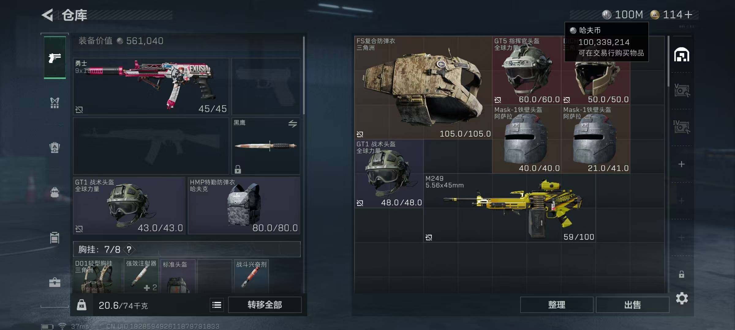 【SJZG2785】总资产(M):135M/哈夫币(K):100339K/哈夫币(K):100339K/传说枪皮数:12/全面战场等级:35_段位:列兵/烽火地带等级:60_段位:黄金/蛊-能天使午夜邮差/红狼-电锯惊魂/近战-黑鹰/ASh-12战斗步枪-鹅鸭杀/SCAR-H战斗步枪-启航/腾龙突击步枪-捞点薯条/KC17突击步枪-电锯惊魂/Vector冲锋枪-能天使-午夜邮差/勇士冲锋枪-能天使-午夜邮差/QCQ171冲锋枪-鹅鸭杀/QJB201轻机枪-鹅鸭杀/AWM狙击步枪-捞点薯条/93R
