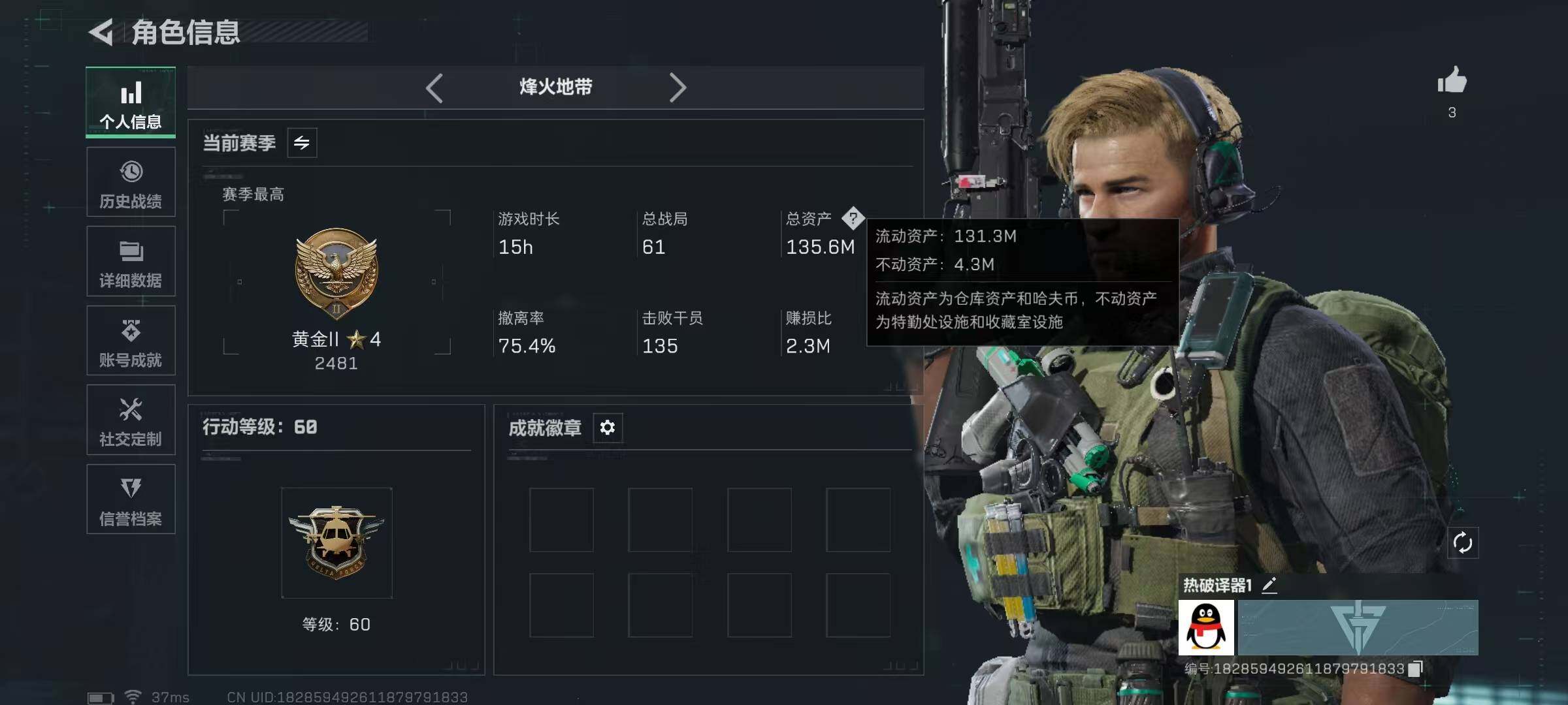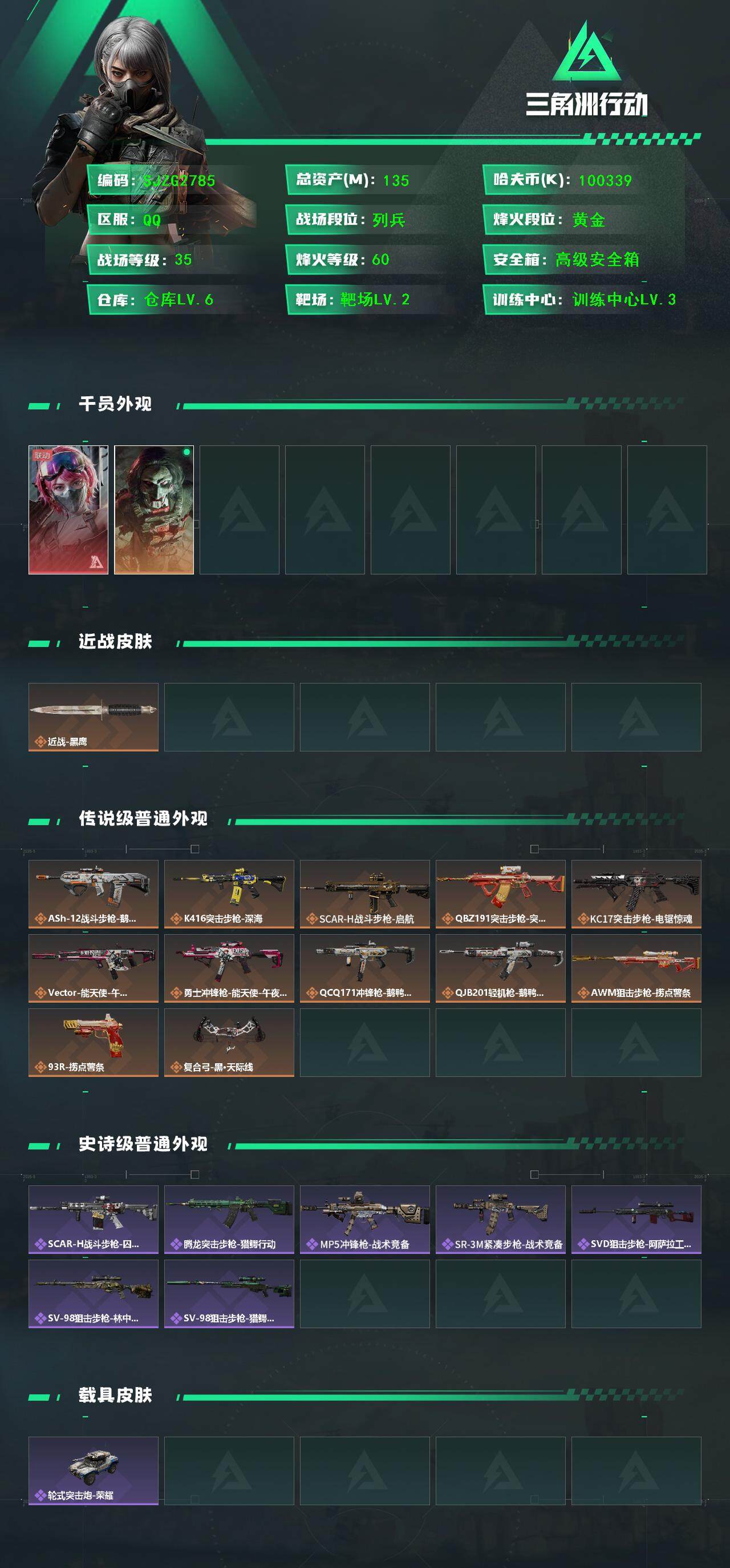总资产(M):135M/哈夫币(K):100339K/传说枪皮数:12/全面战场等级:35_段位:列兵/烽火地带等级:60_段位:黄金/