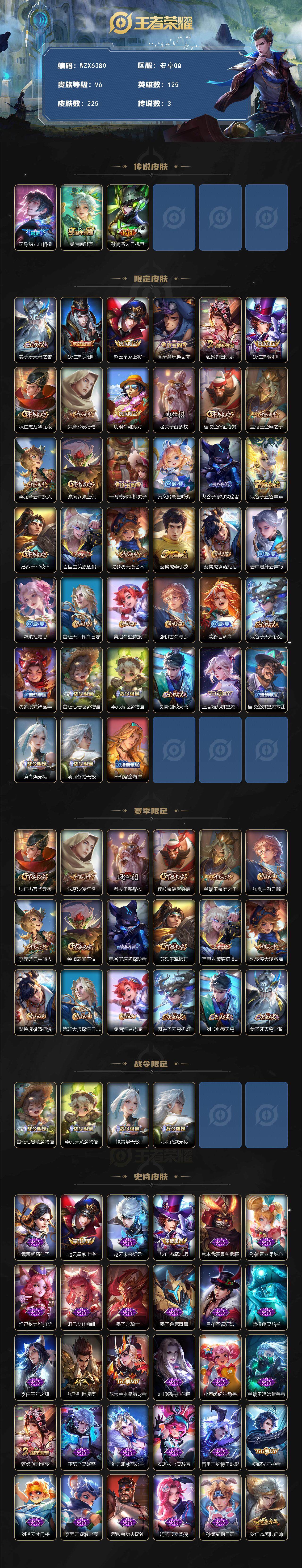 【WZX6380】贵族6/皮肤225/传说3/史诗51/英雄125/影全皮/司马懿九山相柳/桑启-鸣野蒿/孙尚香-末日机甲/姜子牙-天穹之誓/狄仁杰-阴阳师/赵云-皇家上将/高渐离-玩趣恶龙/甄姬-游园惊梦/狄仁杰-魔术师/狄仁杰-万华元夜/达摩-沙漠行僧/项羽-海滩派对/老夫子-醍醐杖/程咬金-演武夺筹/兰陵王-金庭之子/李元芳-云中旅人/钟馗-驱傩正仪/干将莫邪-胡桃夹子/蔡文姬-繁星吟游/鬼谷子-原初探秘者/鬼谷子-五谷丰年/苏烈-千军破阵/百里玄策-原初追逐者/沈梦溪-大漠名商/裴擒虎-