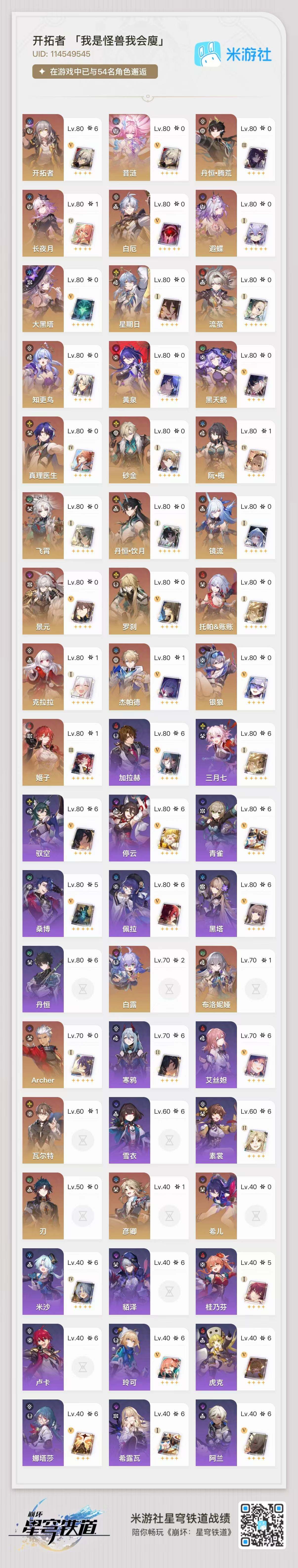 【BHC92】等级:70/总黄数:32/女主/角色黄数:32/丹恒•腾荒/昔涟/长夜月/白厄/遐蝶/大黑塔/星期日/流萤/知更鸟/黄泉/黑天鹅/真理医生/砂金/飞霄/Archer/勿忘她的火焰