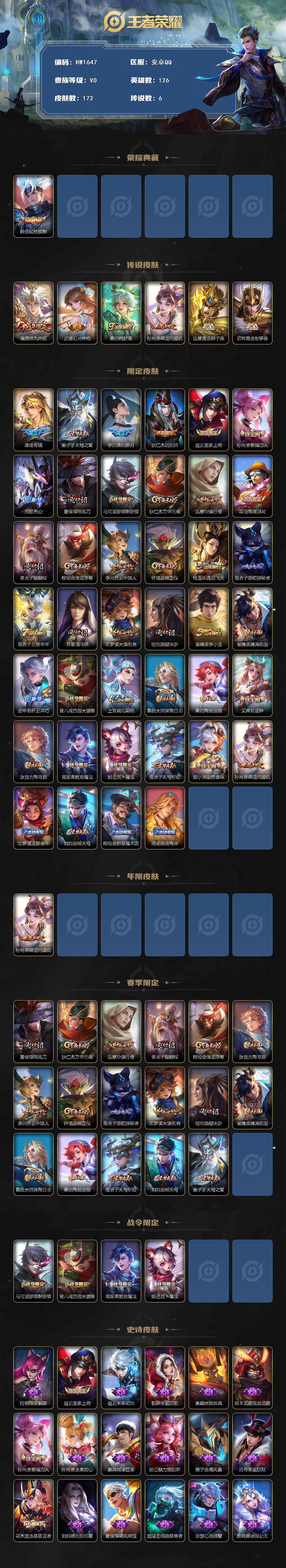 皮肤172 英雄126 至尊星耀 荣耀典藏1 传说6 其他皮肤62-172皮肤1典藏皮肤6传说 弑枪猎影 愿照九州拓 乘龙问璇玑 黄金狮子座 黄金
