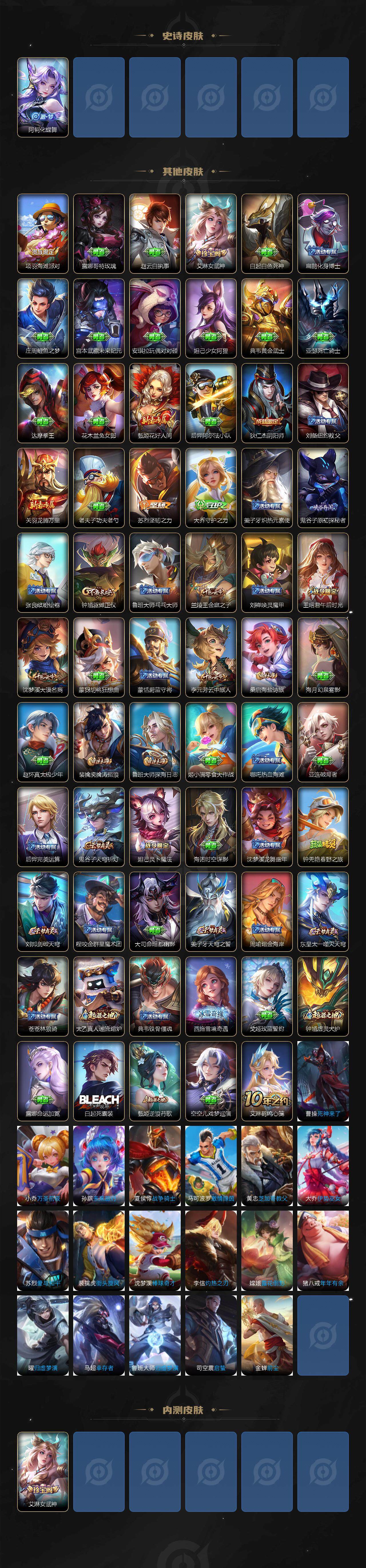 【限定皮肤】:蒙犽顽岩魄,姜子牙天穹之誓,狄仁杰阴阳师,赵云皇家上将,元歌无心,狄仁杰魔术师,项羽海滩派对,王昭君午后时光,兰陵王金庭之子,李元芳云中旅人,钟馗驱傩正仪,鬼谷子原初探秘者,鬼谷子五谷丰年,梦奇顽趣,沈梦溪大漠名商,裴擒虎擒涛扼