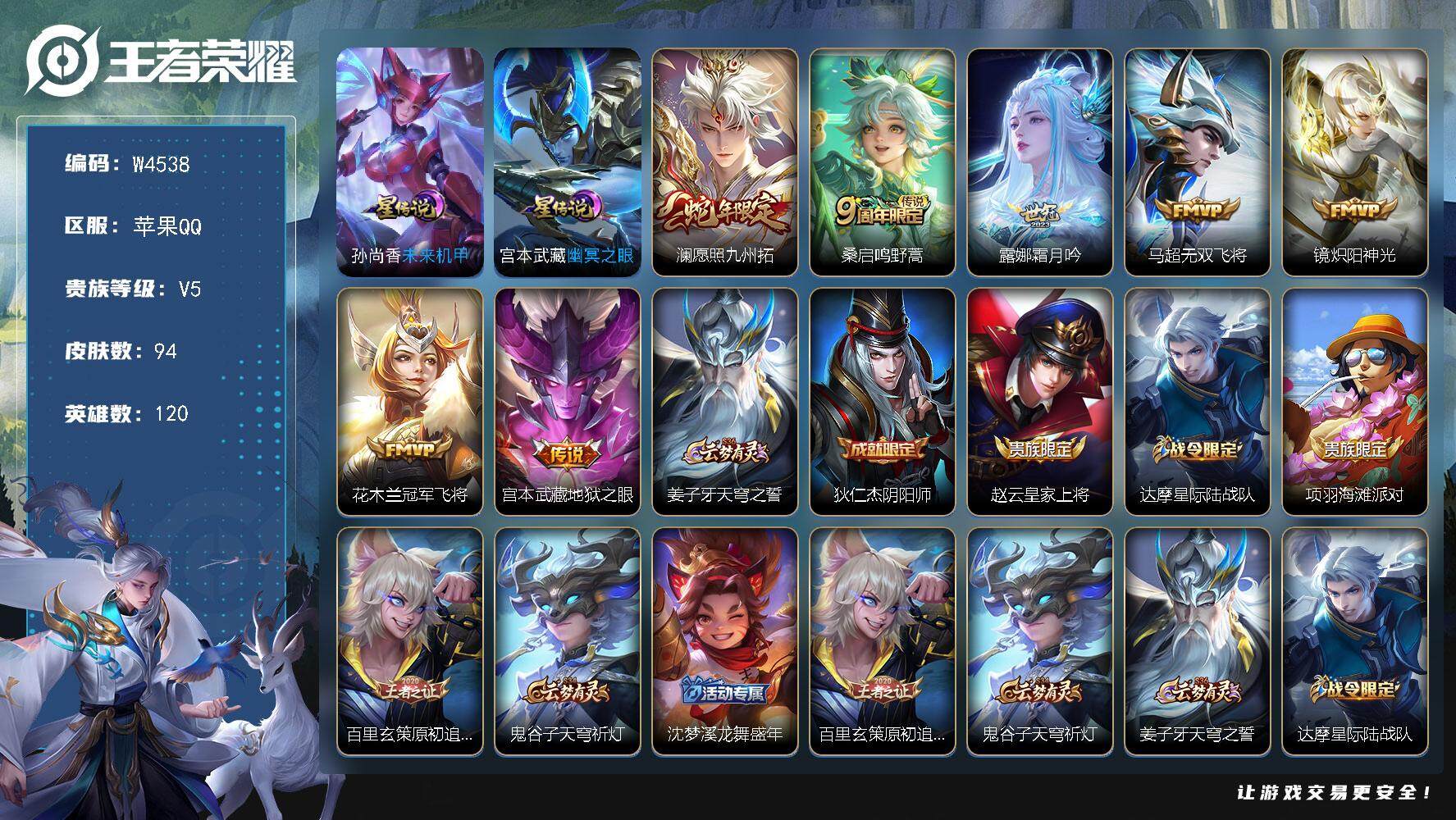 【W4538】苹果QQ-无二次-贵5-120英雄-94皮肤-7传说-2星元-2