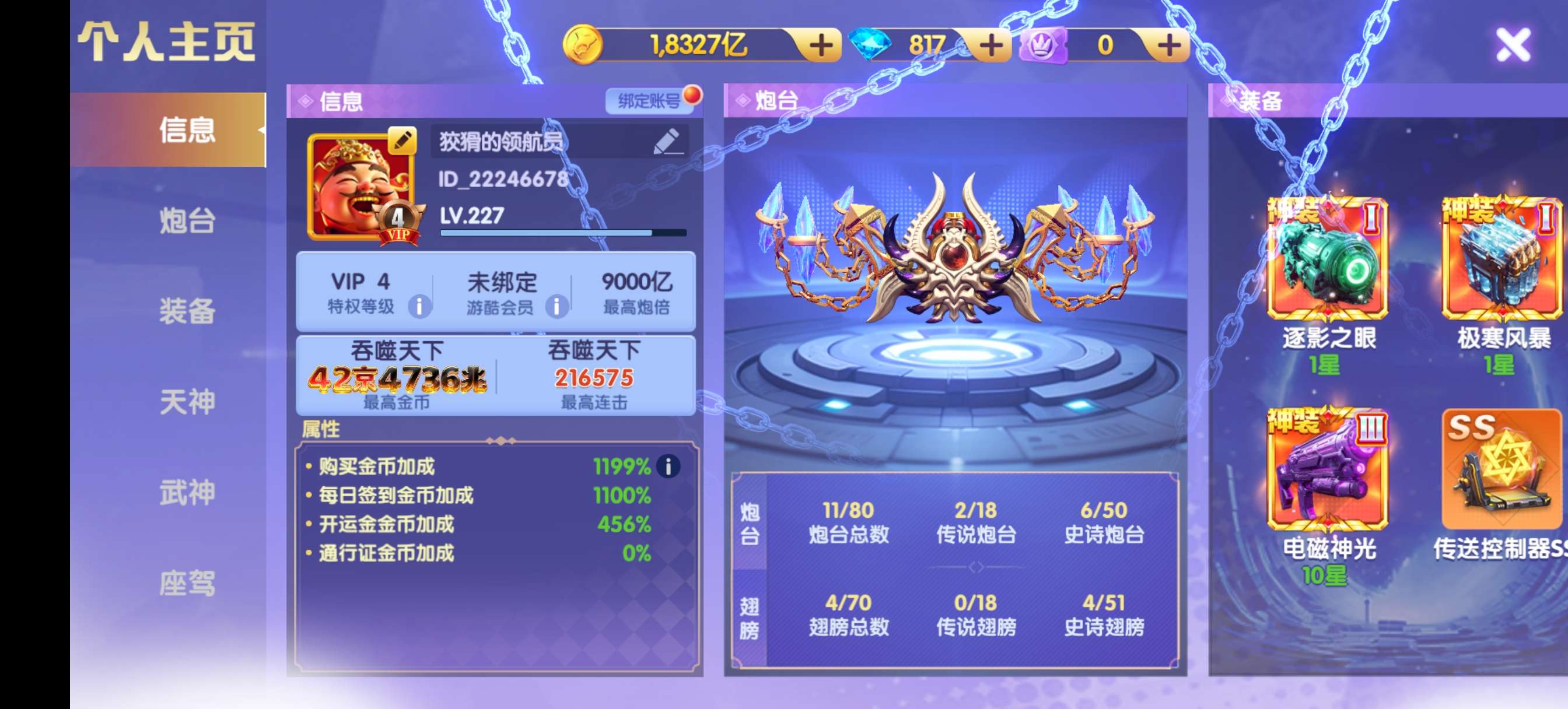 极品小号9000炮上过100京,天神全上班,三级洪荒,6武神600连斩,神装滋炮,道具多,一口价