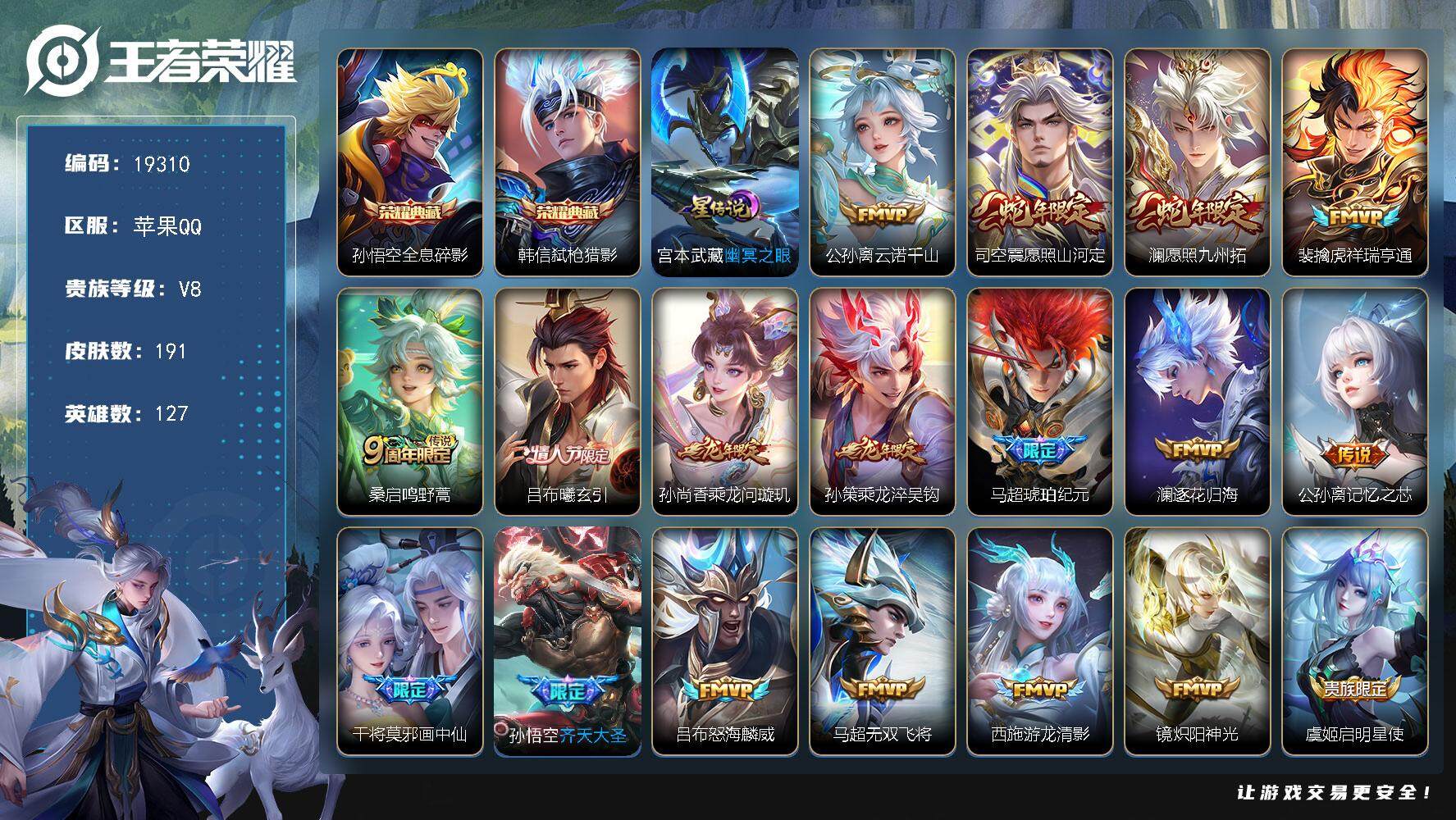 可换绑【V8精品号 打野51段 对抗路40段 澜金标1.21万 马超金标1.16万 老虎金标1.13万 司空震1.1万 7金标 双典藏 龙年孙策 马超琥珀纪元 神威 多传说限定质量号】 28按键,1星传说,8王者印记,五级铭文150,可二次KK7252,苹果Q-V8-191皮肤-2典藏皮肤-20传说-57史诗【英雄全皮】:马超全皮【荣耀典藏】:孙悟空全息碎影,韩信