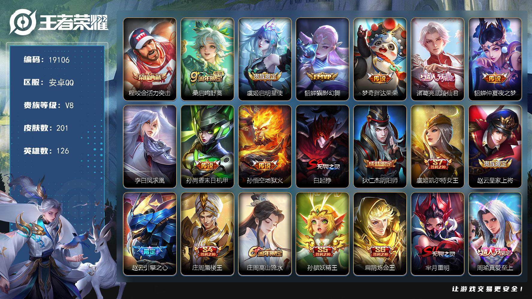 可换绑【性价比优质号】 1按键 3王者印记 五级铭文100 可二次BX2768 安卓Q-V8-201皮肤-1典藏皮肤-9传说-44史诗【荣耀典藏】:程咬金活力突击【传说皮肤】:桑启鸣野蒿,虞姬启明星使,貂蝉猫影幻舞,梦奇胖达荣荣,诸葛亮武陵仙君,貂蝉仲夏夜之梦,李白凤求凰,孙尚香末日机甲,孙悟空地狱火【限定皮肤】:白起狰,狄仁杰阴阳师,虞姬凯尔特女王,赵云皇家上将,