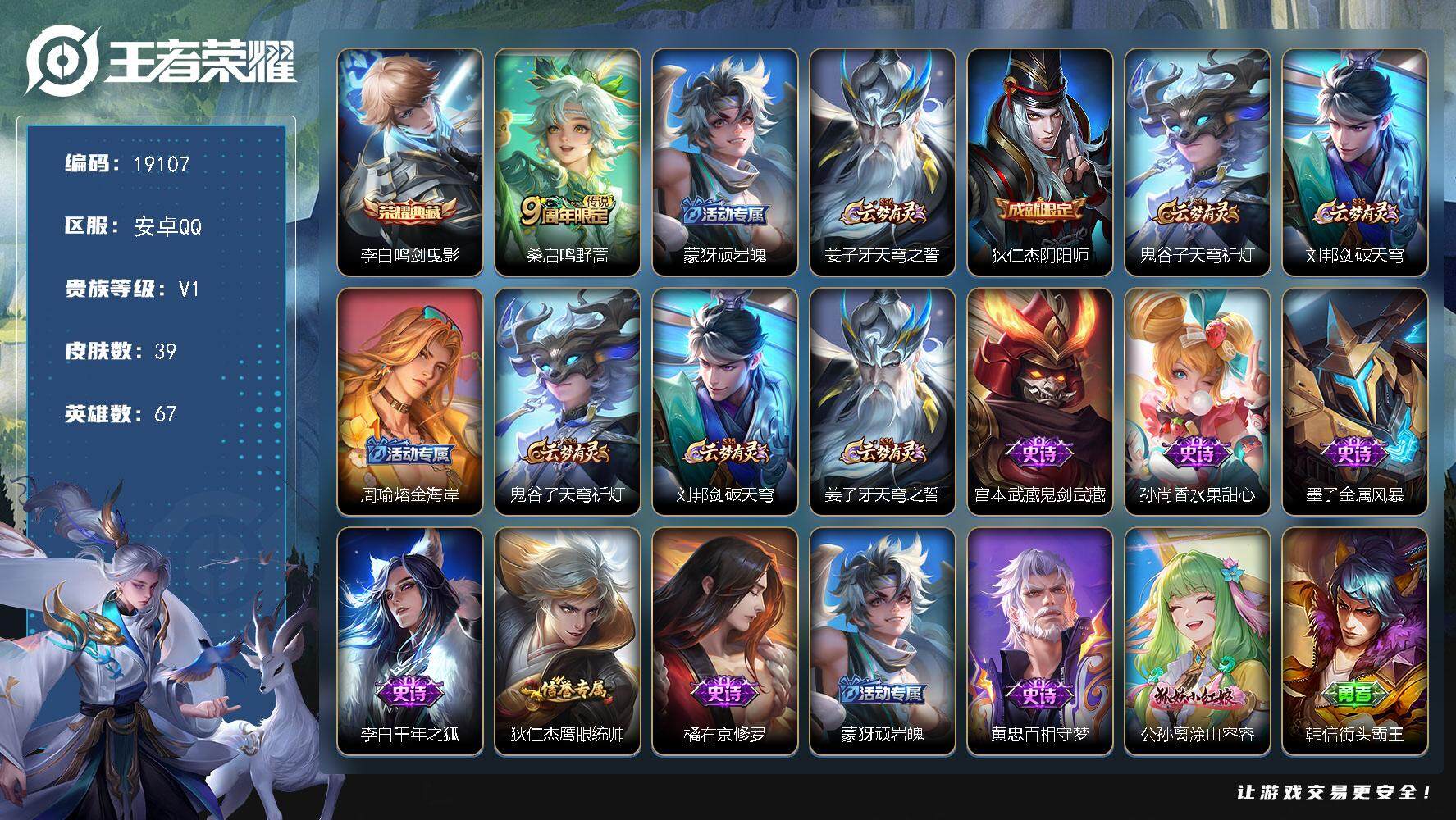 可换绑 2王者印记 五级铭文50 可二次BX2806 安卓Q-V1-39皮肤-1典藏皮肤-1传说-9史诗【荣耀典藏】:李白鸣剑曳影【传说皮肤】:桑启鸣野蒿【限定皮肤】:蒙犽顽岩魄,姜子牙天穹之誓,狄仁杰阴阳师,鬼谷子天穹祈灯,刘邦剑破天穹,周瑜熔金海岸【赛季限定】:鬼谷子天穹祈灯,刘邦剑破天穹,姜子牙天穹之誓【史诗皮肤】:宫本武藏鬼剑武藏,孙尚香水果甜心,墨子金属