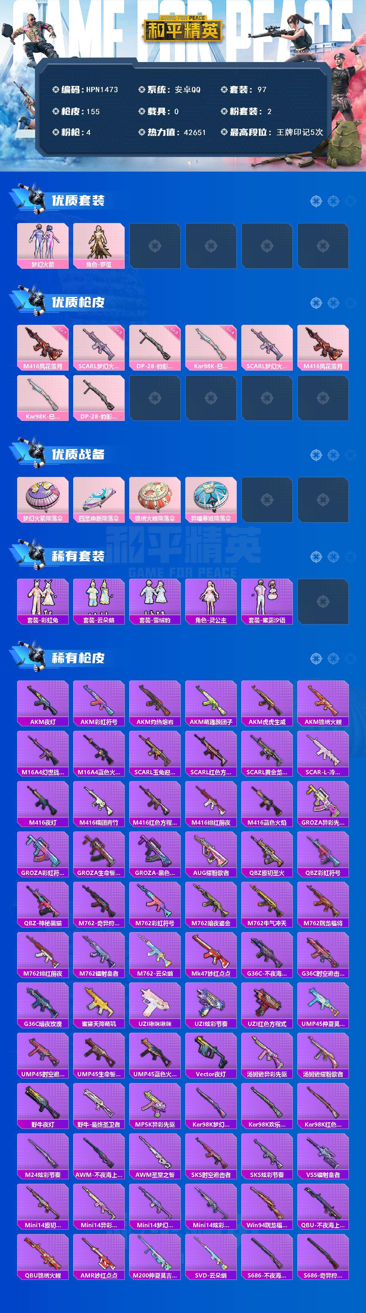 【HPN1473】97套装/枪械4/装备122/战备85/王牌印记5/热力值42651/五级SCAR-L-梦幻火箭/七级M416-风花雪月/四级Kar98K-巳巳如意/五级DP-28-豹影疾电/粉装-梦幻火箭/梦幻火箭/角色-罗征/SCAR-L-梦幻火箭/M416-风花雪月/Kar98K-巳巳如意/DP-28-豹影疾电/梦幻火箭降落伞/四圣焕新降落伞/锦绣火鲤降落伞/异瞳寒姬降落伞/炫彩糖果降落伞/套装-彩虹兔/套装-云朵鹅/套装-雪绒豹/角色-灵公主/套装-蜜露汐语/套装-炫彩糖果/AUG-冰