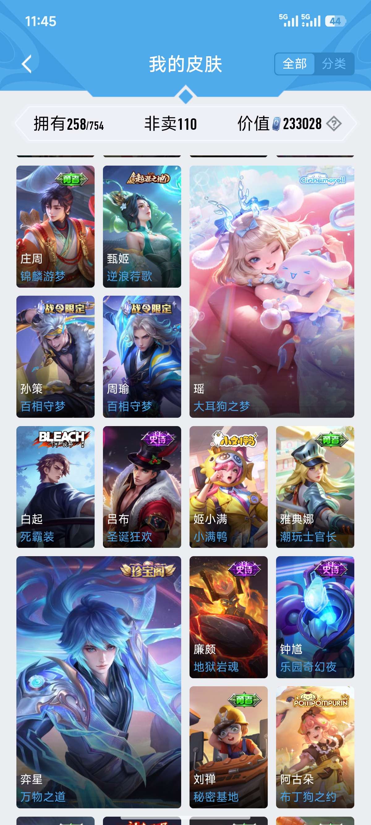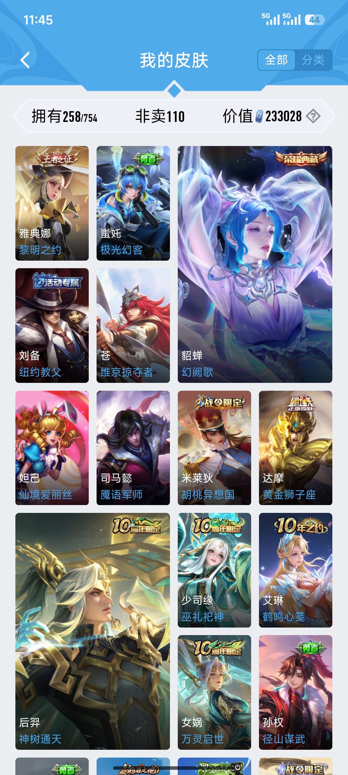 皮肤258 英雄126 至圣王者 荣耀典藏3 珍品传说1 传说12 其他皮肤82-典藏几个传说12个火影多s多金币